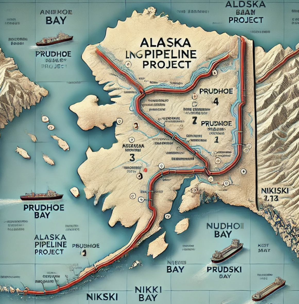 알래스카 가스관 사업은 알래스카 프루도베이(Prudhoe Bay) 가스전에서 생산된 천연가스를 남부 니키스키(Nikiski) 지역까지 약 1,300km의 가스관을 통해 운송한 후, 액화하여 해외로 수출하는 초대형 인프라 프로젝트입니다.
