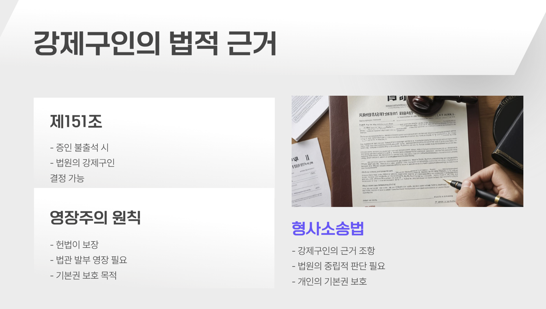 • 강제구인과 강제인치를 통해 피의자나 증인의 출석을 보장하여 수사 및 재판이 차질 없이 진행될 수 있습니다.