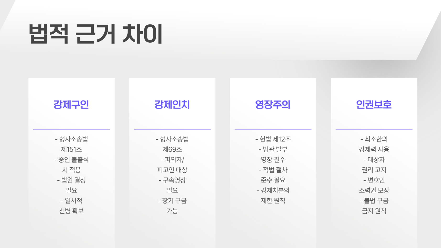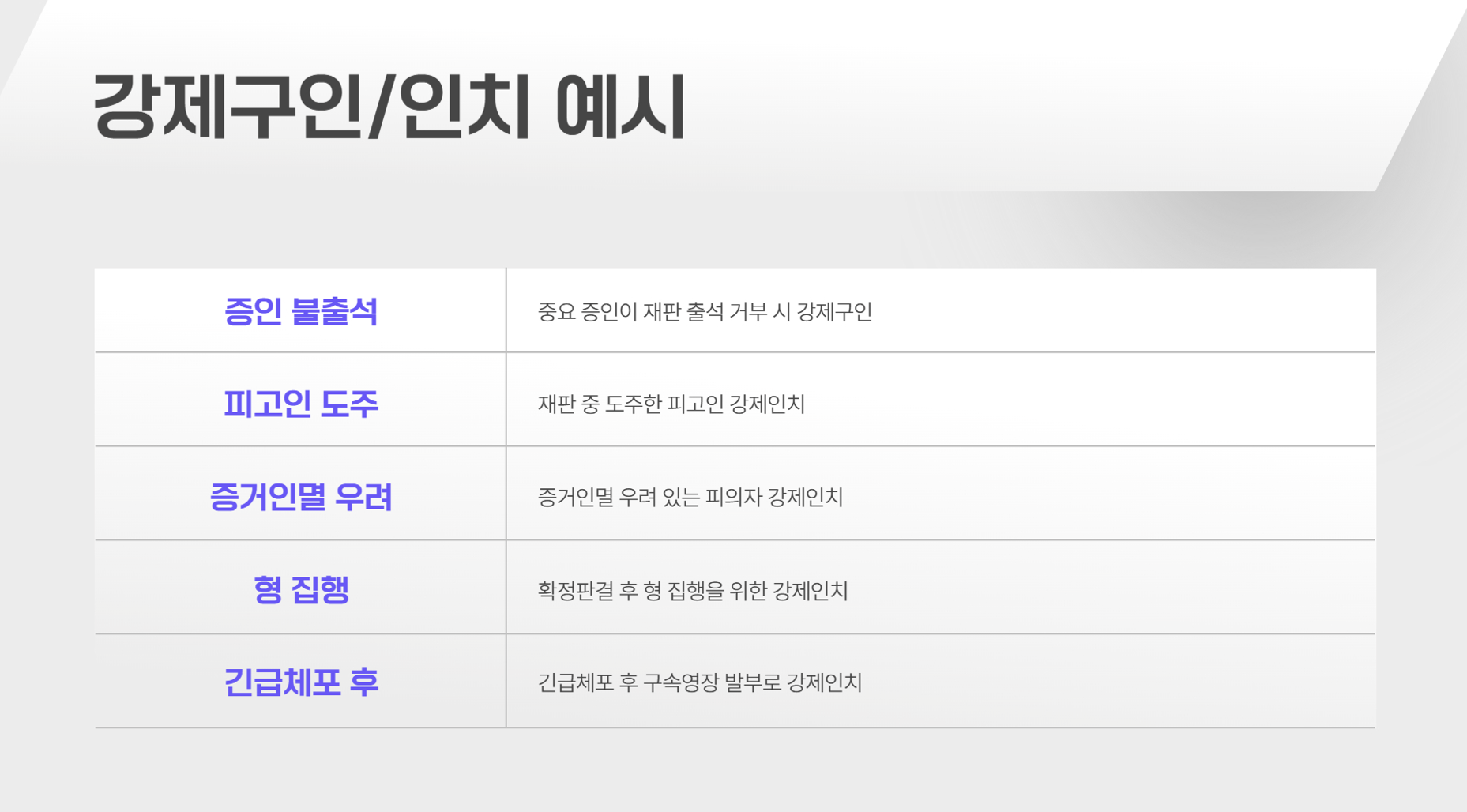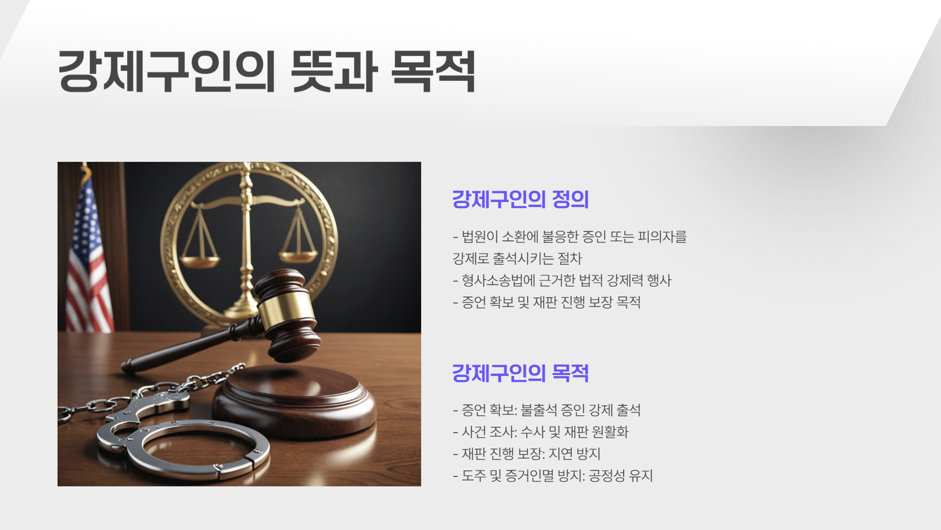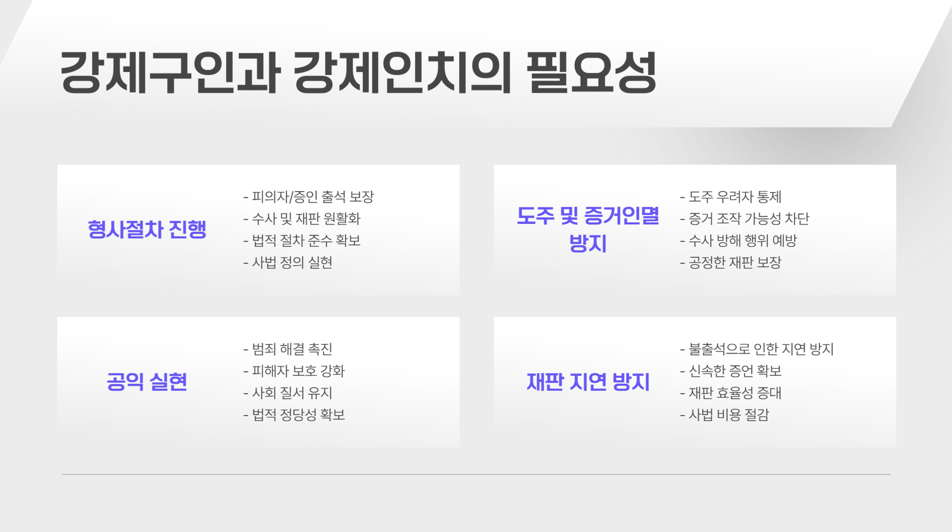 • 강제구인은 증인의 불출석을 방지하고, 강제인치는 도주 및 증거 인멸을 막기 위해 시행됩니다.