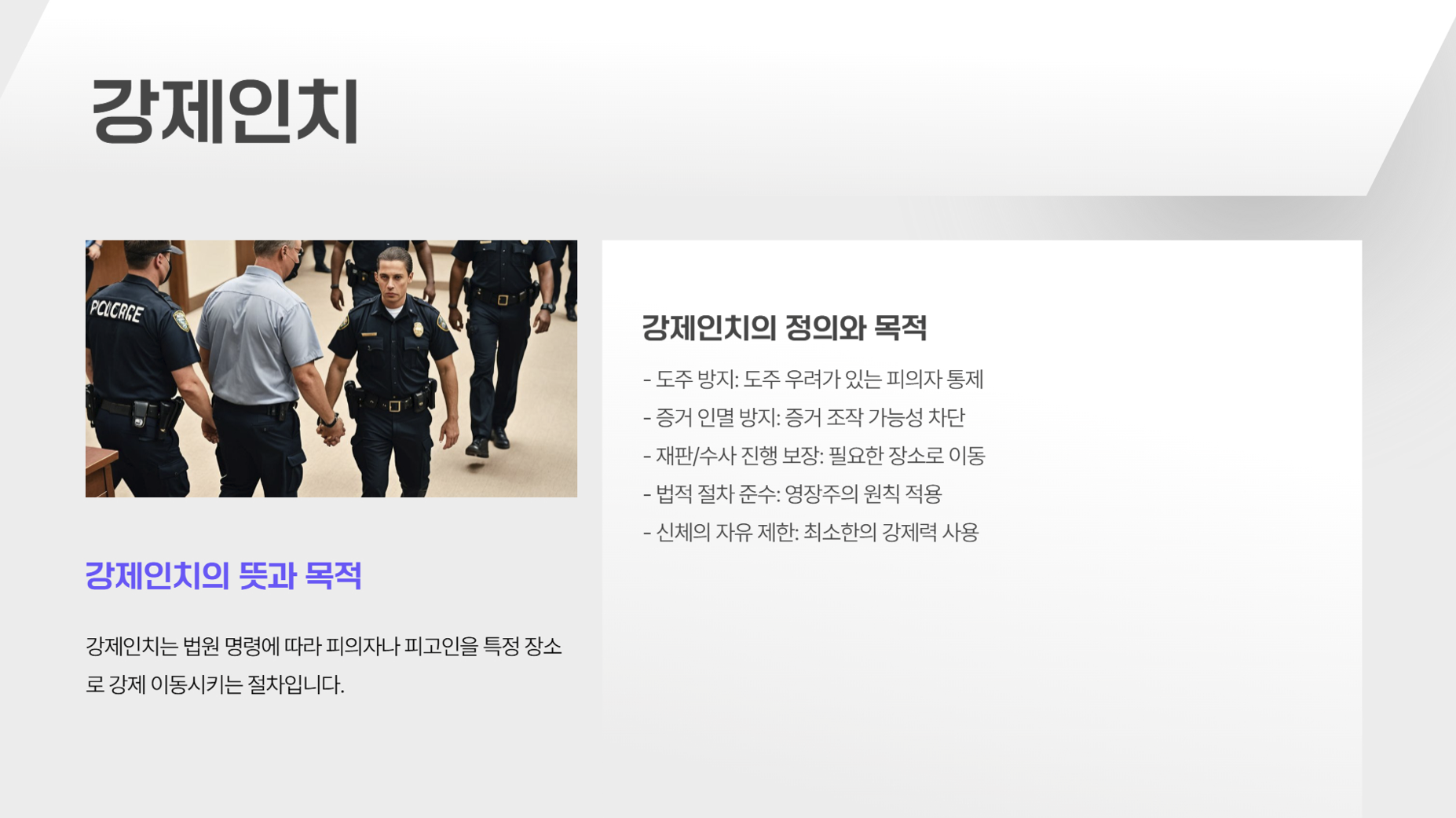 • 강제인치는 도주 우려가 있는 피의자나 피고인을 특정 장소로 이동시키는 것입니다.