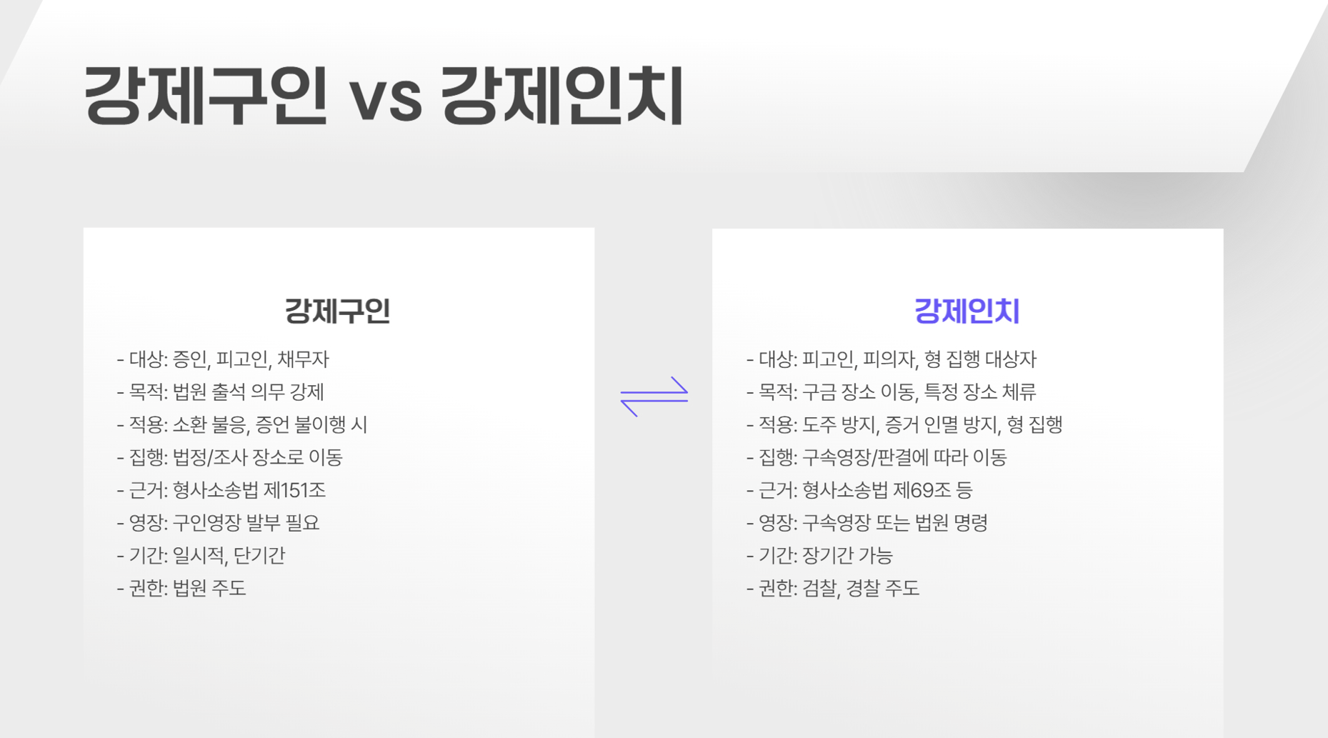 - 강제구인은 증인의 불출석을 방지하고, 강제인치는 도주 및 증거 인멸을 막기 위해 시행됩니다.