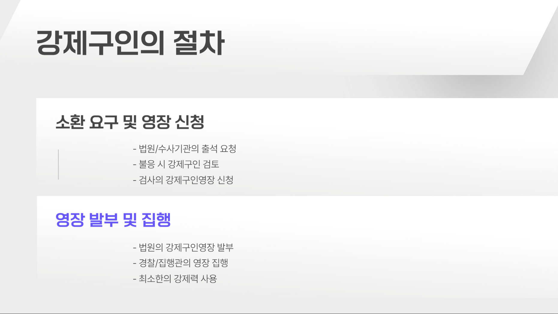 • 강제구인: 법원이 소환 명령을 내렸는데도 불응하는 증인을 강제로 법정으로 데려오는 절차.
