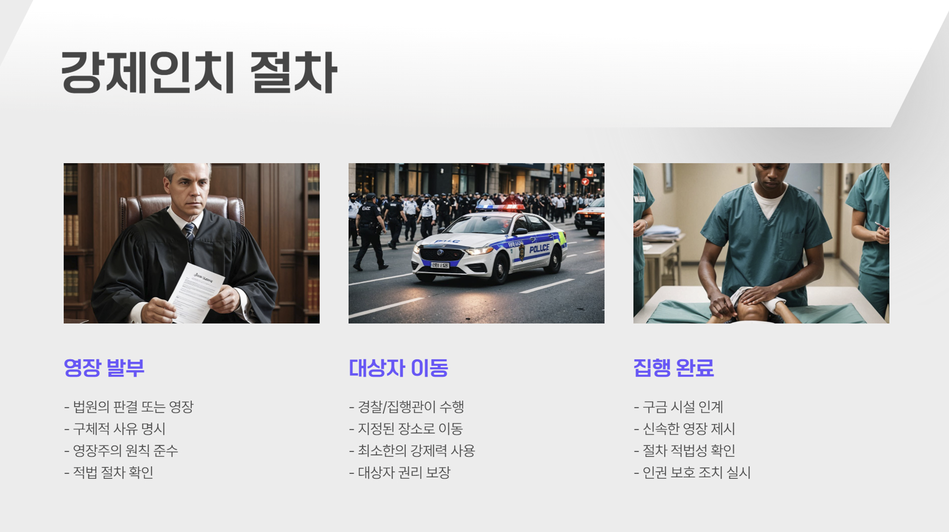 • 범죄 사건을 공정하게 해결하고, 피해자 보호 및 사회 질서를 유지하기 위해 강제구인과 강제인치는 필수적입니다.