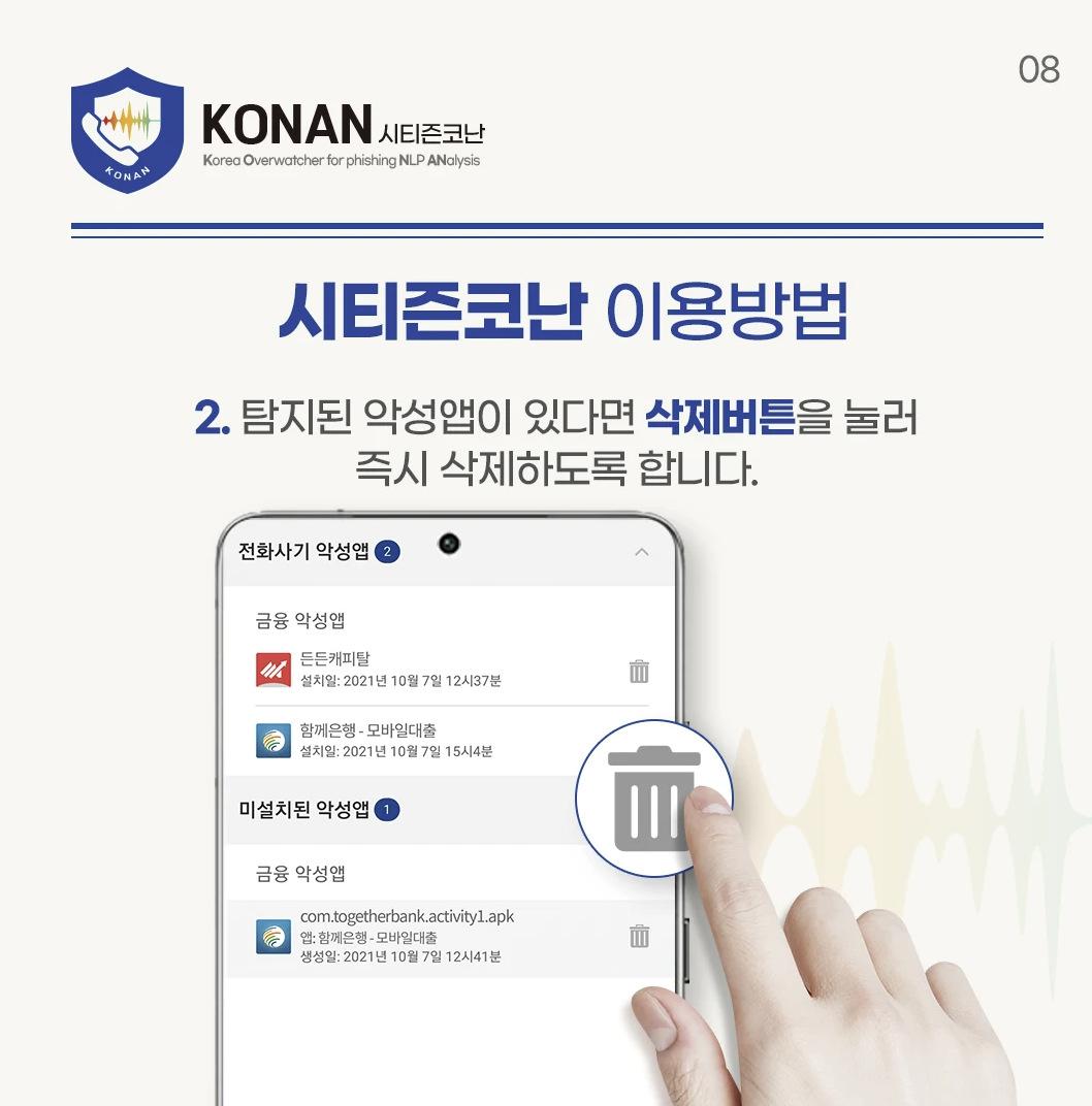 시티즌코난은 경찰청에서 공식 제공하는 스마트폰 보안 앱으로, 보이스피싱과 같은 금융 사기를 예방하고, 악성 앱을 탐지해 삭제할 수 있도록 도와주는 필수 도구입니다. 또한 긴급 신고 기능을 통해 위급한 상황에서 빠르게 경찰과 연결될 수 있도록 지원합니다. 스마트폰 보안을 강화하고, 안전한 디지털 환경을 유지하는 데 꼭 필요한 앱이니 반드시 설치해 보세요!