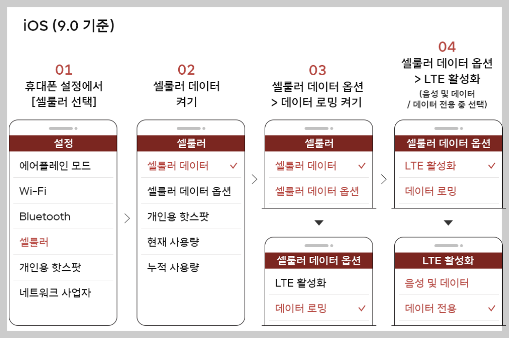 📌 해외에서 데이터 요금제를 신청한 경우에는 반드시 '데이터 로밍'을 켜야 정상 사용 가능!