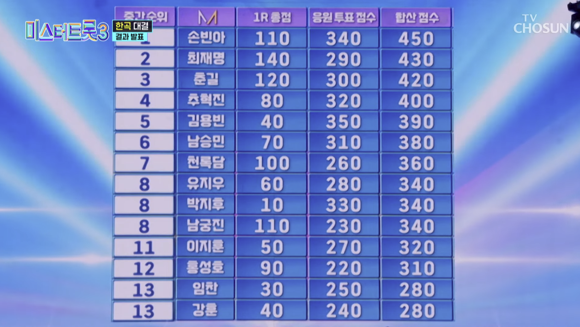 ✔ 손빈아(450점) 🏆 > 김용빈(390점)