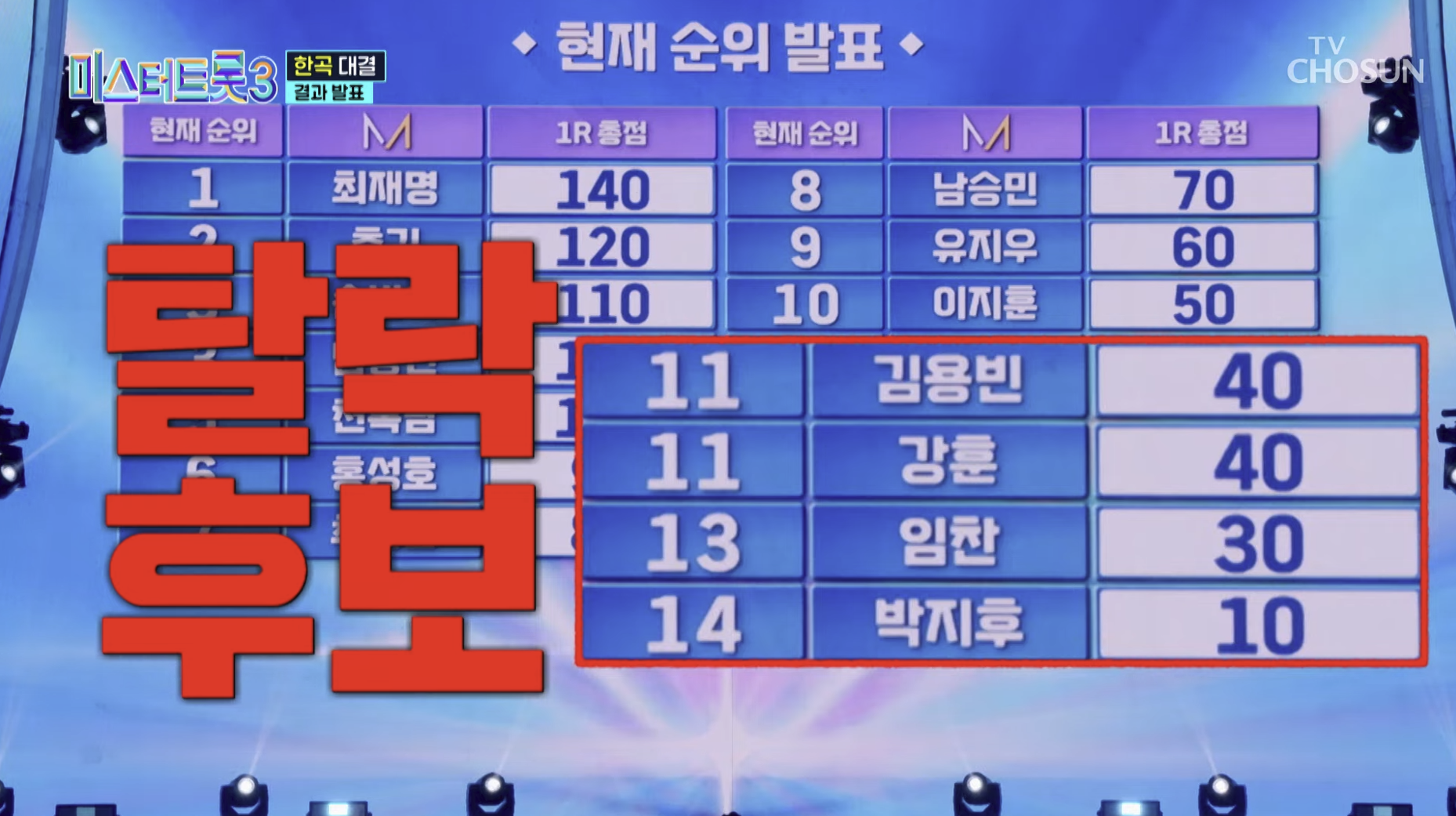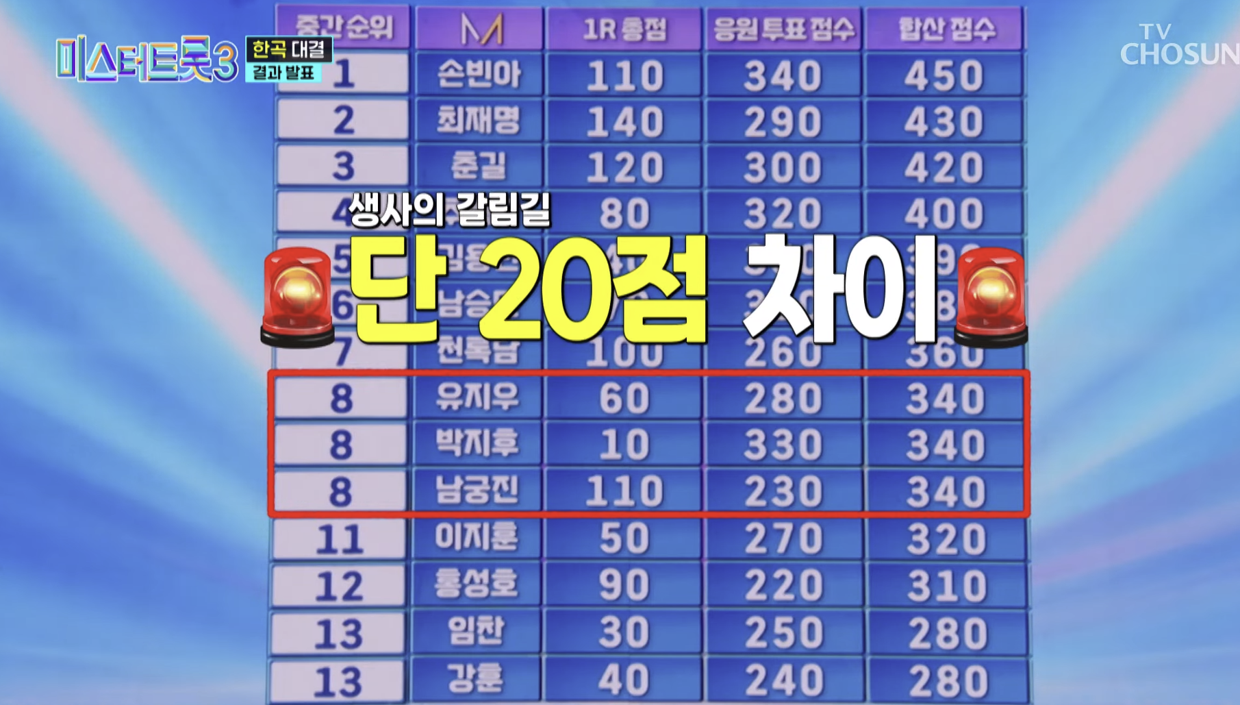 이번 방송에서는 마스터 13인 점수 + 국민 대표단 200명 투표 + 대국민 응원 투표 점수가 합산되었으며, 이 점수를 바탕으로 결승 진출 가능성이 높은 참가자와 탈락 위기 참가자가 가려졌습니다.