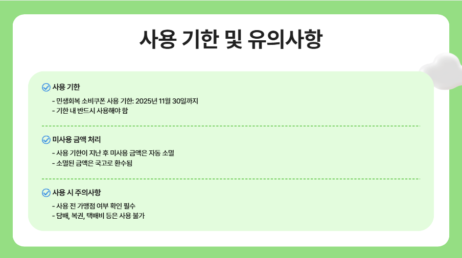 | 사용불가 | 대형마트, 백화점, 온라인몰, 유흥업소, 공과금 등 |