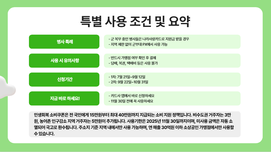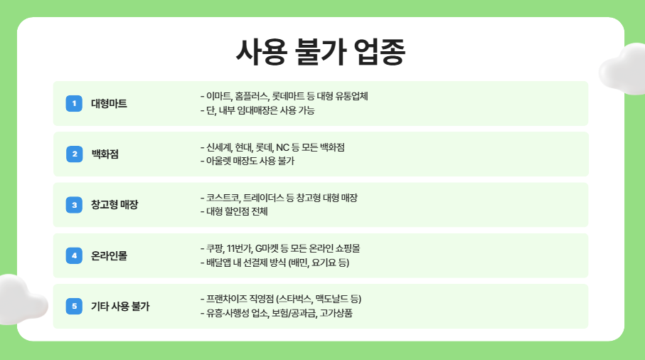 | 사용불가 | 대형마트, 백화점, 온라인몰, 유흥업소, 공과금 등 |