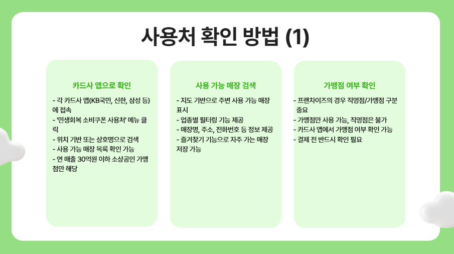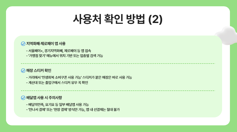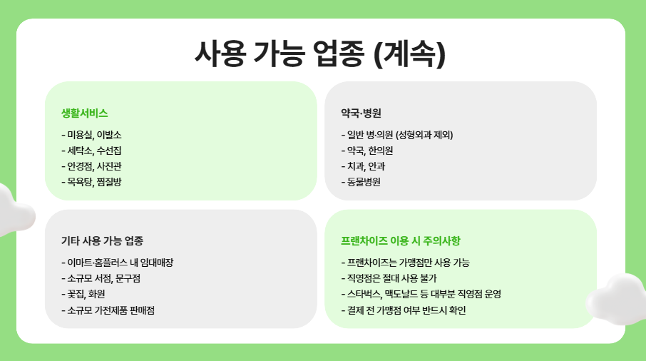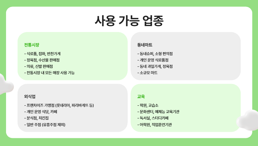 | 사용처 | 전통시장, 약국, 병원, 학원, 편의점(가맹점), 배달앱(현장결제) |