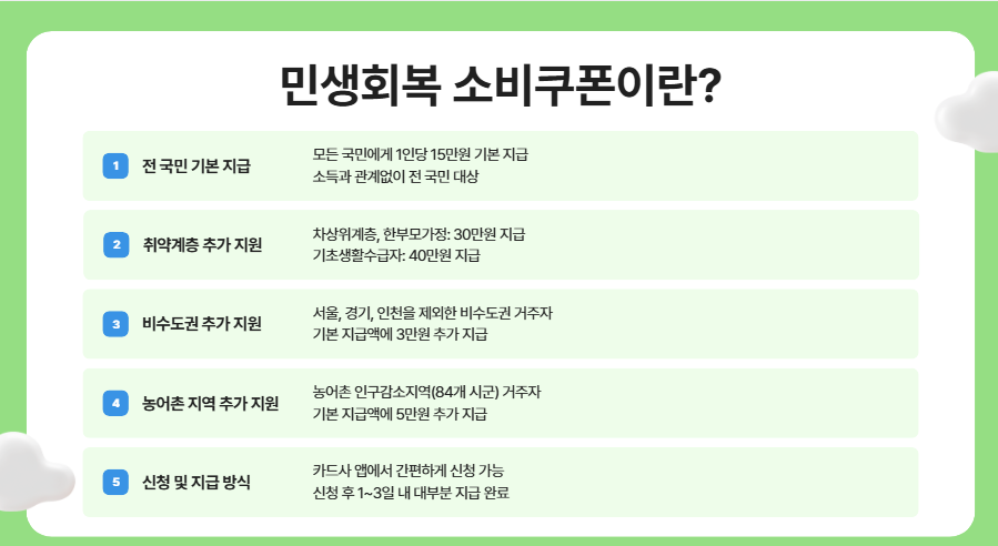 2025년 정부가 시행하는 민생회복 소비쿠폰(지원금)은 물가 상승과 경기 침체로 어려움을 겪는 국민들의 생활안정을 돕기 위한 정책입니다. 농협카드를 사용하는 분들은 이번 기회를 통해 최소 1