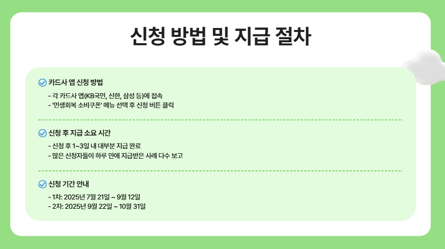 신청은 카드사 앱에서 간단히 가능하며, 신청 후 1~3일 내 대부분 지급되고 있습니다. 실제로 많은 신청자들이 하루 만에 지급받았다는 후기를 올리고 있습니다.