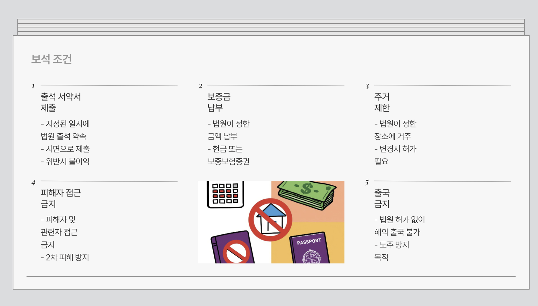 • 법원은 피고인의 출석 서약, 보증금 납부, 주거 제한 등의 조건을 부과합니다.