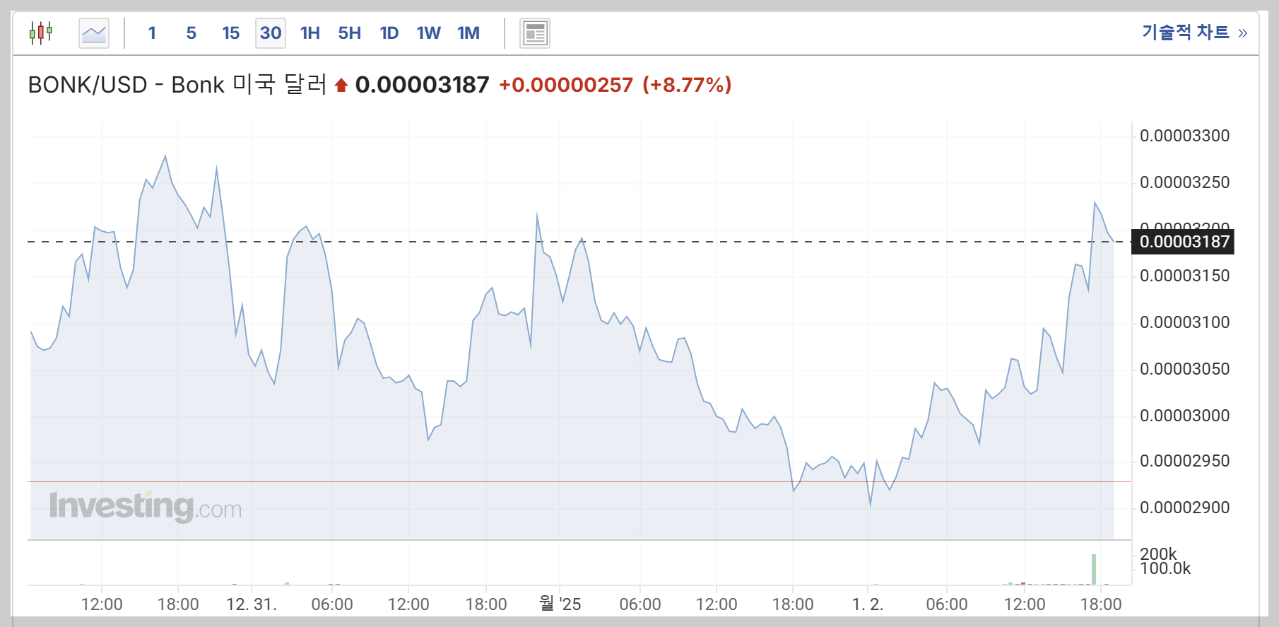 - 상승 추세: 9 EMA와 20 EMA가 모두 상승세를 보이고 있으며, 이는 봉크의 가격이 긍정적인 방향으로 움직이고 있음을 나타냅니다.