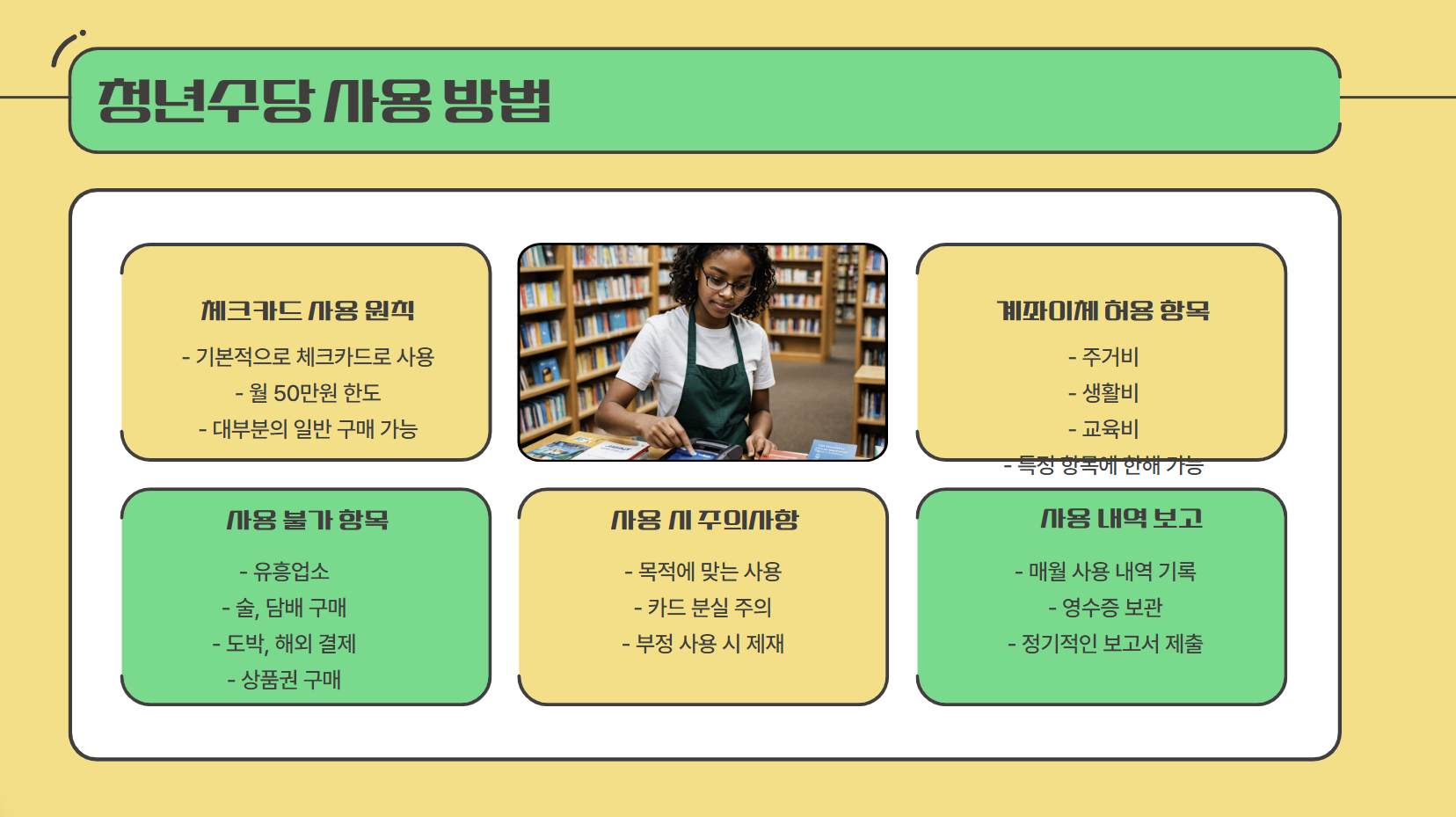 사용 방법: 체크카드 지급 (일부 항목에 한해 계좌이체 가능)