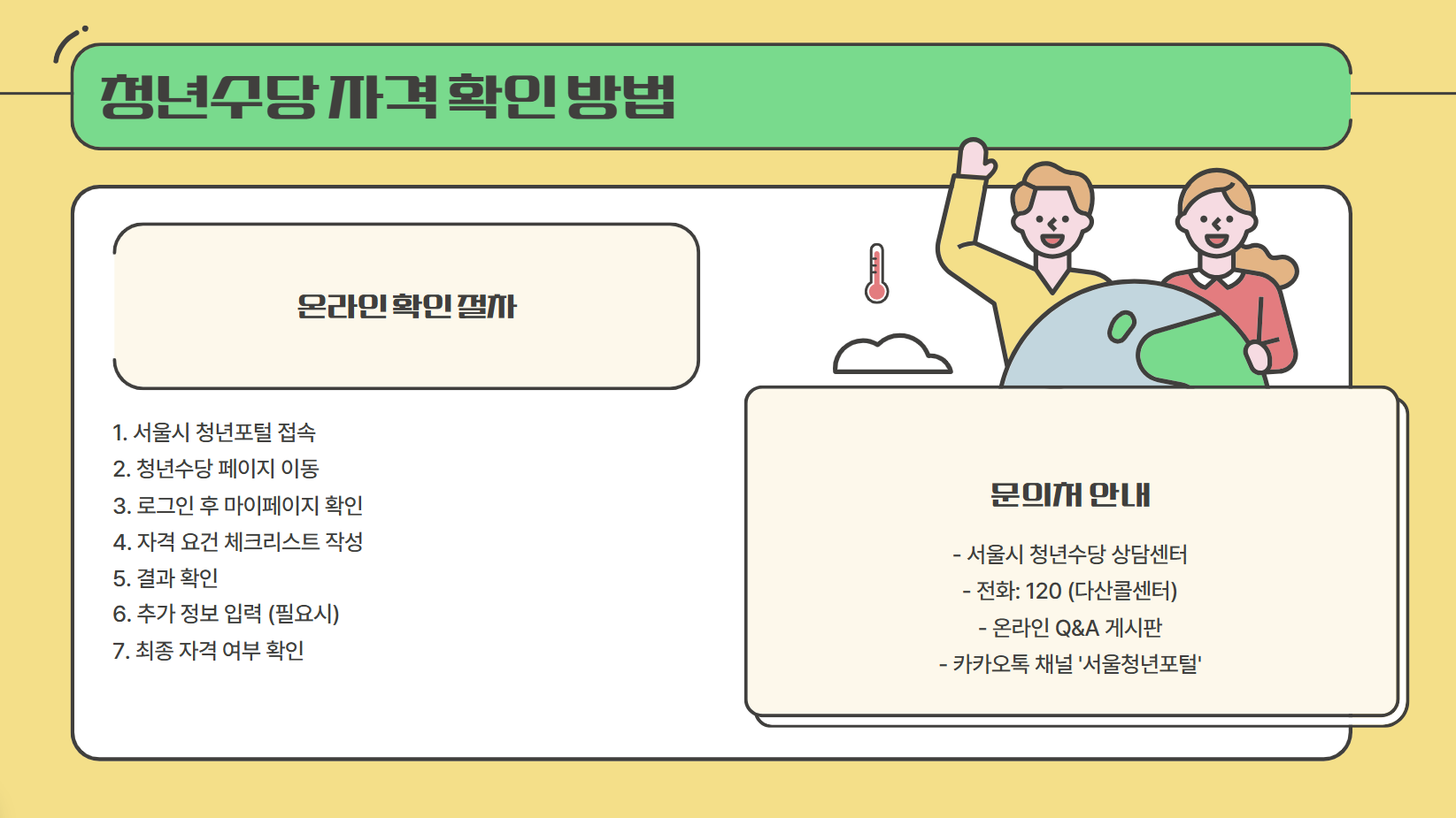 📞 문의처: 서울시 청년수당 상담센터 ☎️ 120 다산콜센터