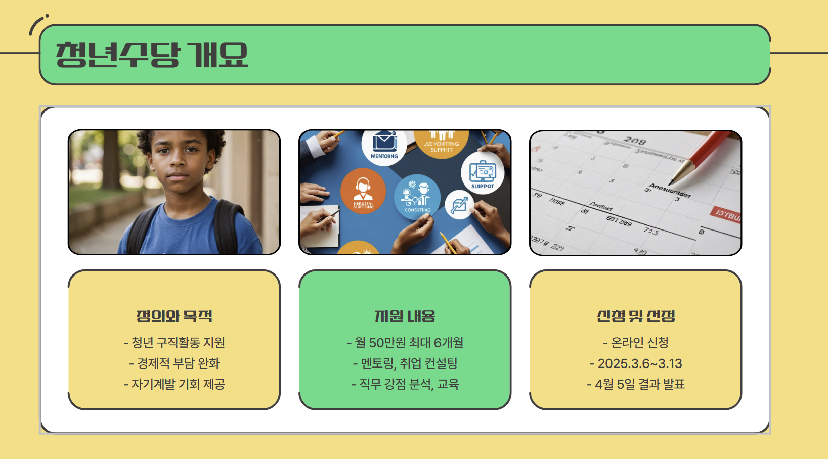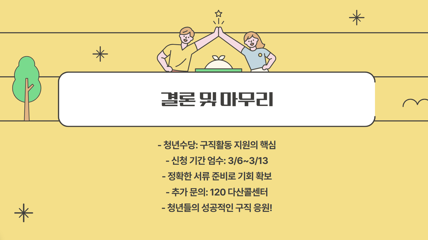 청년수당을 통해 안정적으로 구직 활동을 하면서 취업 성공까지 이루시길 바랍니다! 😊