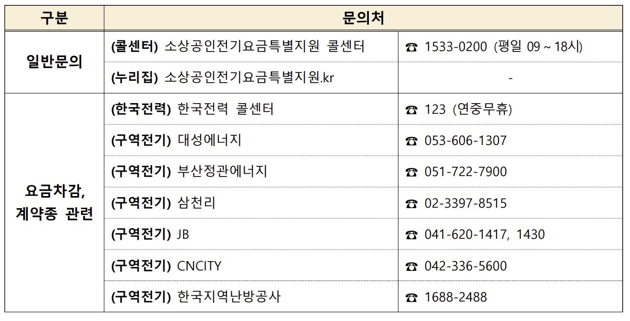 궁금한 점이 있다면 소상공인전기요금특별지원.kr 또는 콜센터(☎1533-0200)를 통해 문의하세요.
