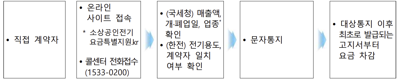 - 온라인 신청: 한국전력과 직접 계약된 경우, 전용 웹사이트(소상공인전기요금특별지원.kr)에서 고객번호와 사업자 정보를 입력하여 신청합니다.