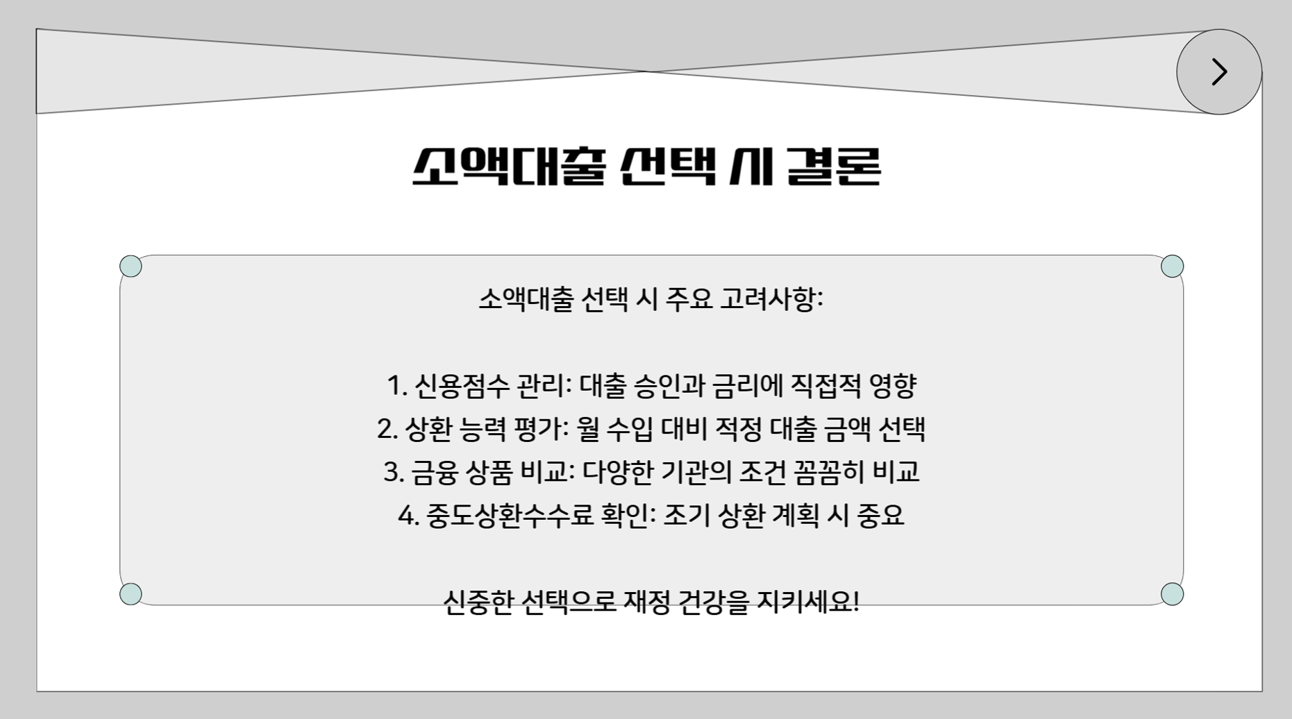 ✅ 상환 계획 수립: 자신의 상환 능력에 맞는 금액만 빌리고, 명확한 상환 계획을 세우는 것이 중요합니다.