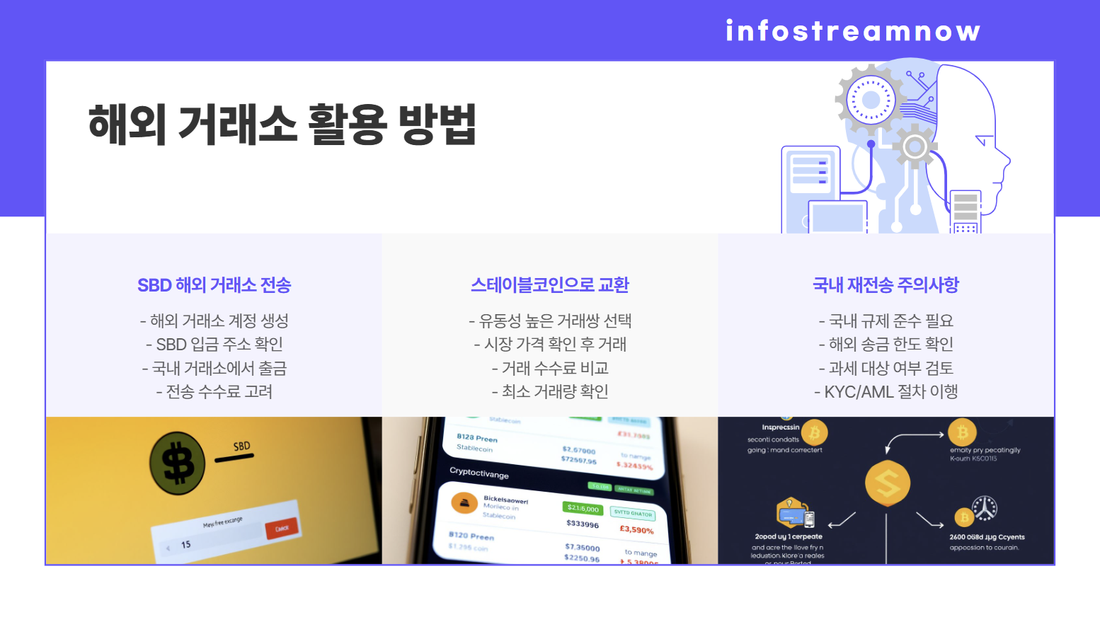 국내 거래소에서 SBD의 지원이 종료된 후에도 해외 거래소에서 SBD를 지원하는 경우, 이를 활용해 다른 스테이블코인으로 전환할 수 있습니다.