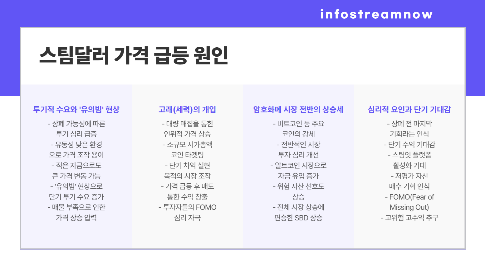 - 시장의 매물대 얇음: 스팀달러는 거래량이 적고 유동성이 낮아 상대적으로 적은 자금으로도 가격을 크게 움직일 수 있는 환경을 제공합니다.
