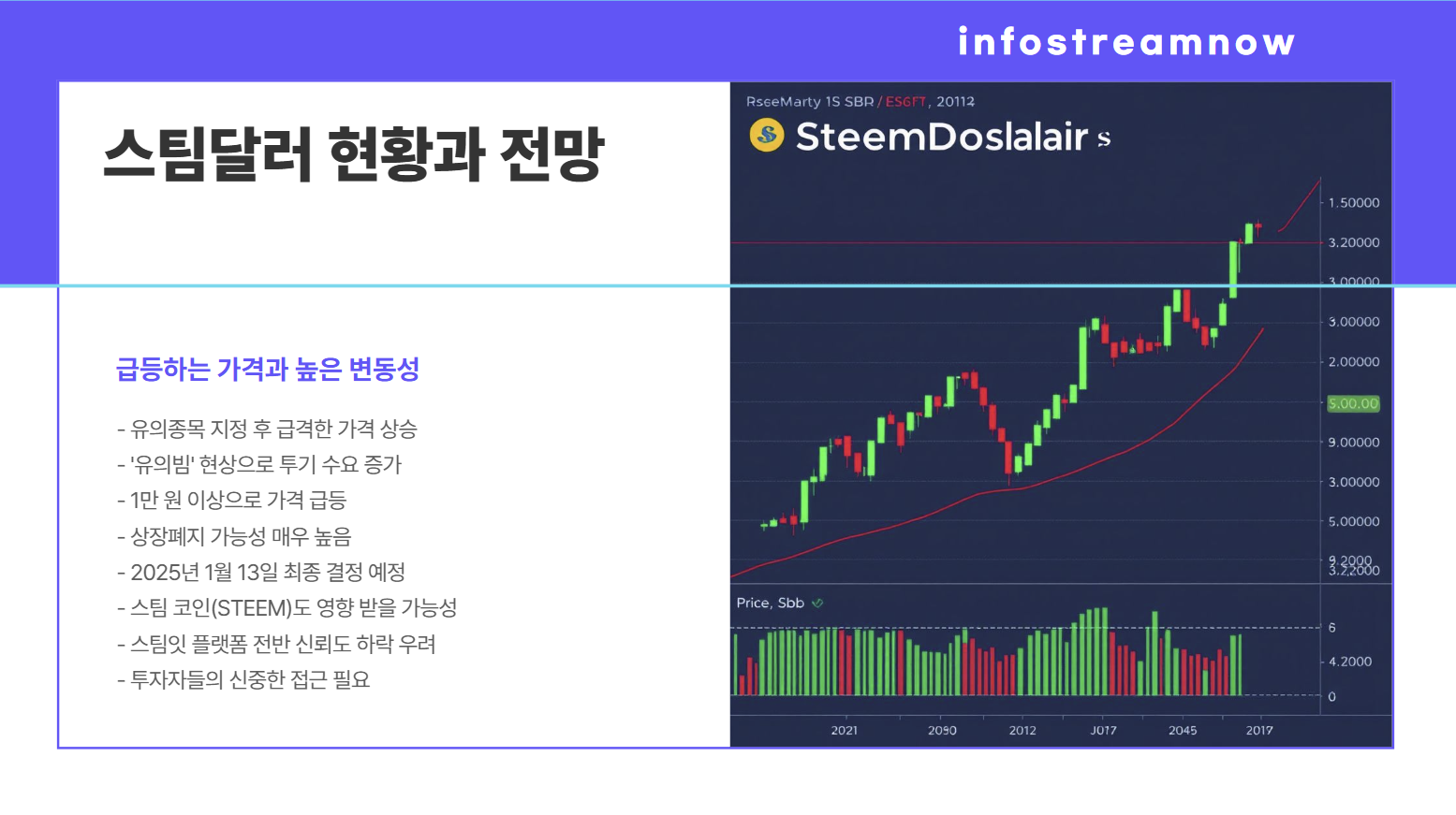 - 상폐 전 마지막 기회 심리: 일부 투자자들은 상장폐지 전에 단기적인 수익을 기대하며 스팀달러에 투자하고 있습니다. 이는 상폐 가능성을 알면서도 단기간 내 큰 수익을 노리는 심리에서 비롯됩니다.