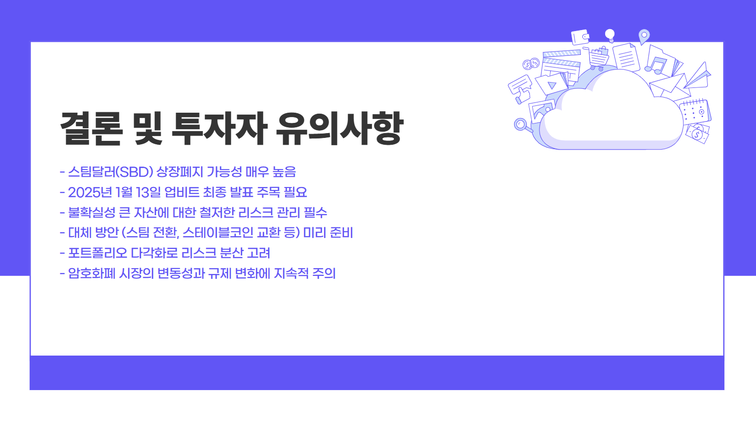 스팀달러(SBD)는 현재 상장폐지 가능성이 매우 높은 자산으로 평가되고 있습니다. 투자자들은 불확실성이 큰 자산에 투자할 때 철저한 리스크 관리와 신중한 접근이 필요합니다. 향후 업비트의 최종 발표가 스팀달러의 운명을 결정짓는 중요한 순간이 될 것입니다. 투자자들은 이 발표를 주의 깊게 확인하며 전략적인 대응을 준비해야 할 것입니다.