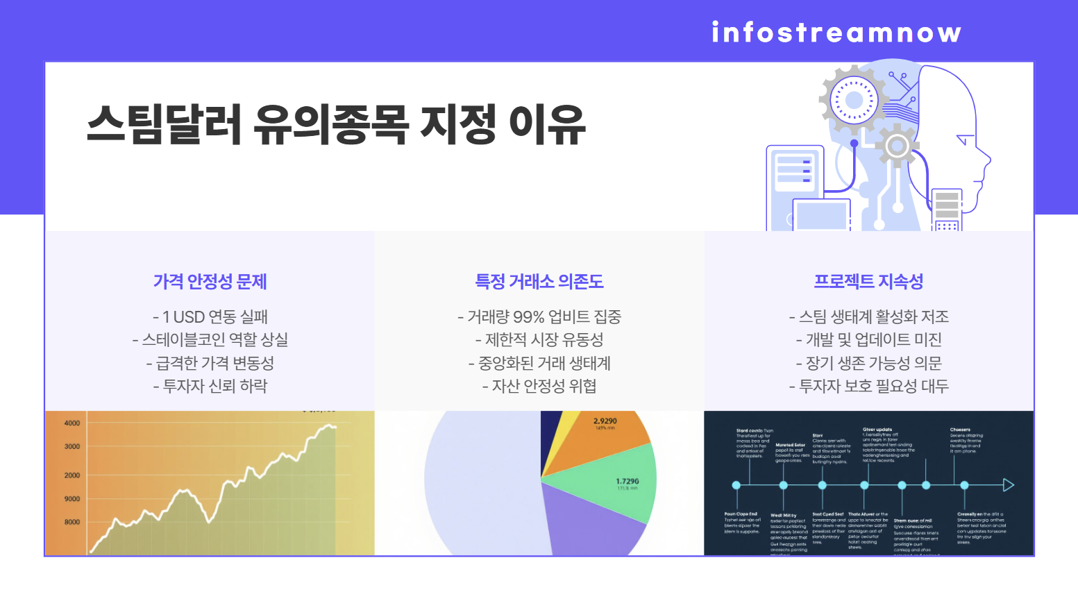 스팀달러는 본래 1 USD에 연동된 스테이블코인으로 설계되었습니다. 하지만 최근 몇 년간 이 연동이 제대로 작동하지 않아, 스테이블코인으로서의 신뢰를 상실했습니다. 특히 최근에는 가격이 급등락을 반복하며 스테이블코인의 본질적 역할을 수행하지 못하고 있습니다. 이러한 불안정성은 업비트가 스팀달러를 유의종목으로 지정한 주요 배경 중 하나입니다.