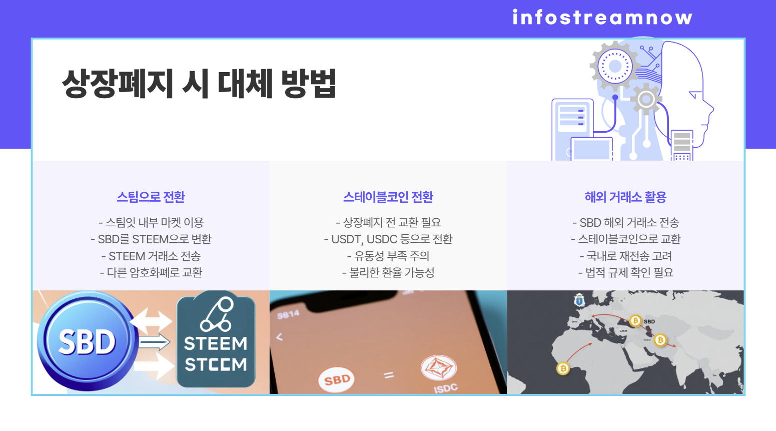 - 일부 거래소에서는 SBD와 주요 스테이블코인의 직접 교환이 제한될 수 있으므로, 중간 자산(예: BTC, ETH)을 거쳐야 할 수도 있습니다.