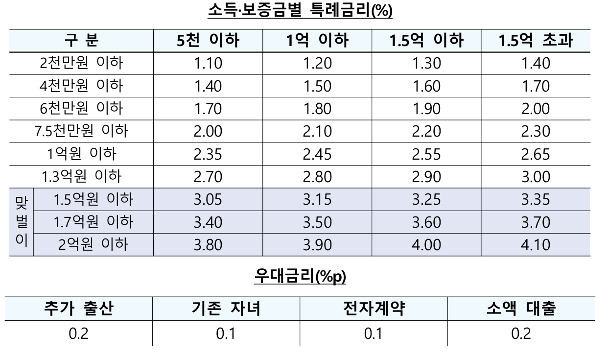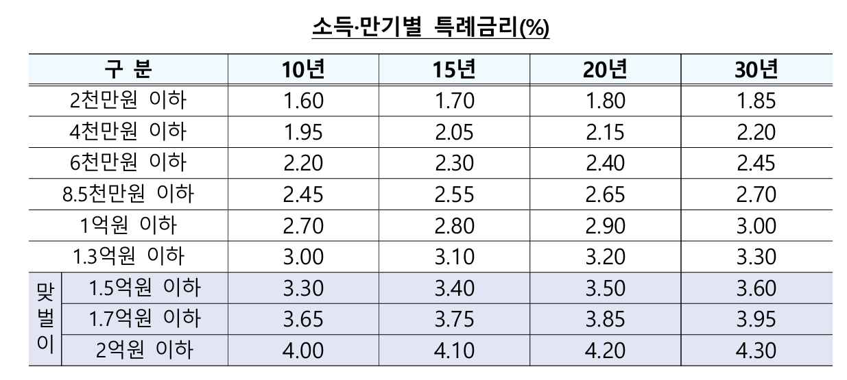 • 연소득 2억 원 이하: 10년 만기 시 연 4.0%, 30년 만기 시 연 4.3%