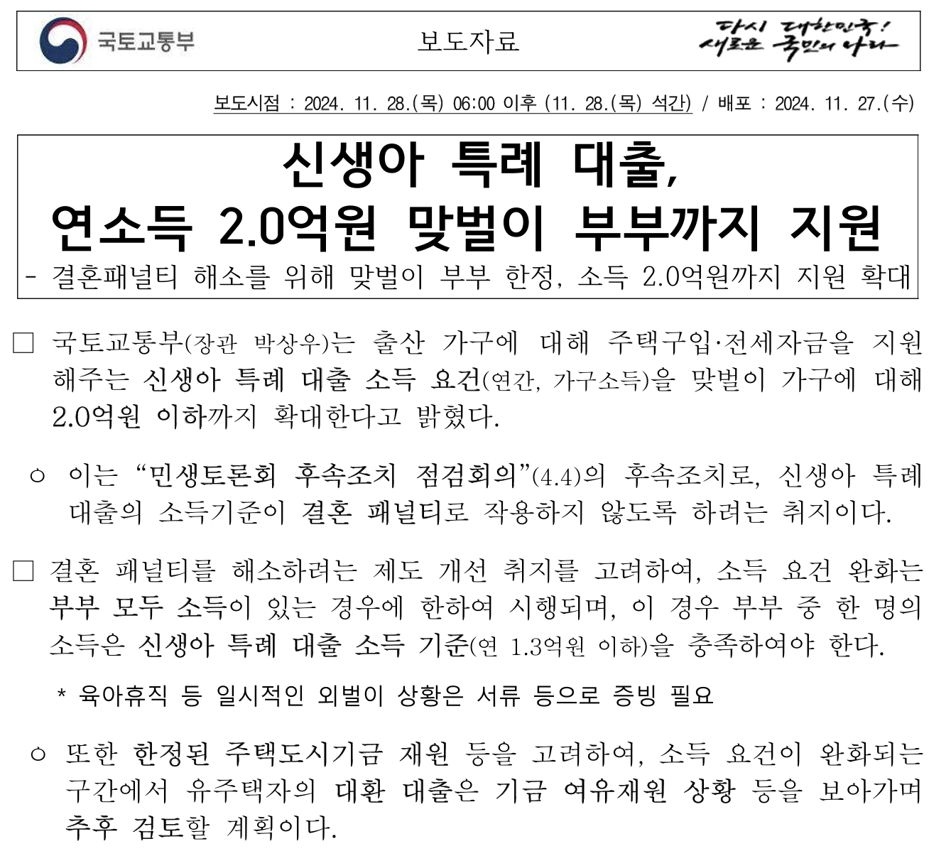 이번 신생아 특례 대출은 2024년 12월 2일부터 확대 시행되어 더 많은 가정이 혜택을 받을 수 있게 되었습니다. 이번 확대로 인해 더 많은 맞벌이 가구와 출산 가정이 주거 부담을 덜 수 있을 것으로 기대됩니다.
