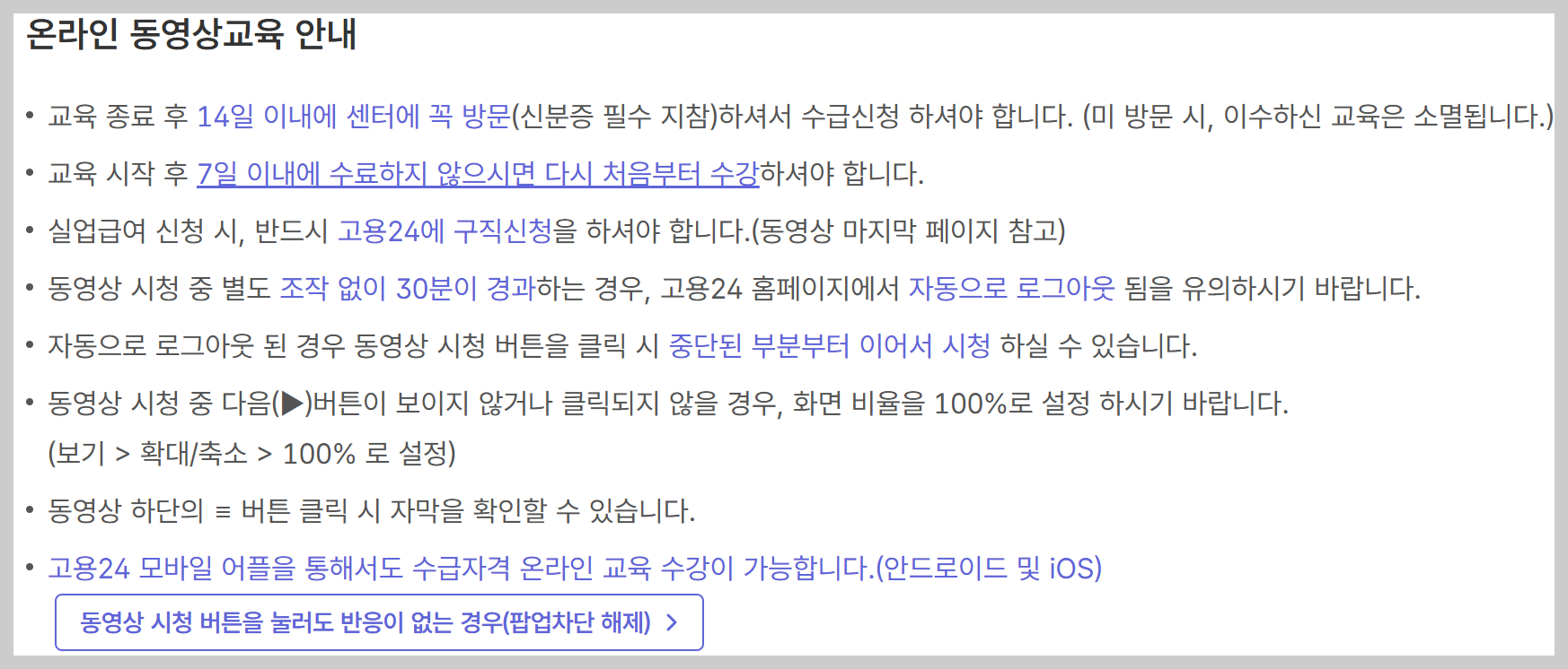 - 고용보험 홈페이지에서 제공하는 교육을 이수합니다.