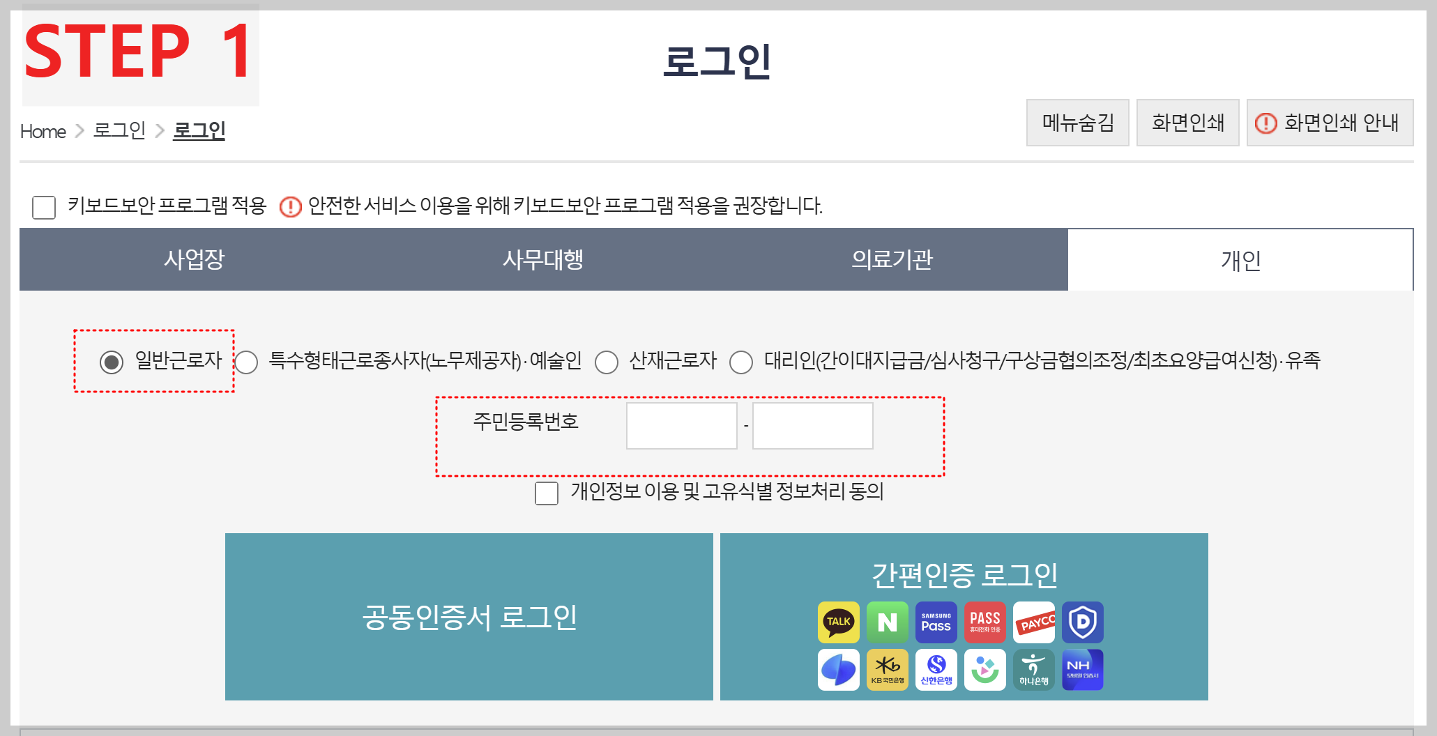 - '고용보험 토탈서비스' 사이트에 접속하여 개인 계정으로 로그인합니다.