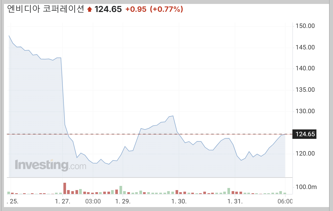 2025년 1월 31일 기준 엔비디아 주가는 124.65달러로 마감되었습니다. 이는 전일 대비 0.768% 상승한 수치이지만, 최근 몇 주 동안 엔비디아 주가는 최고점인 149.43달러 대비 20% 이상 하락하며 변동성이 커진 상태입니다.