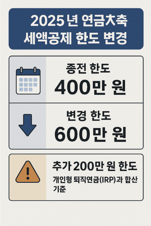 - 연금저축 납입 한도는 연 600만 원입니다.