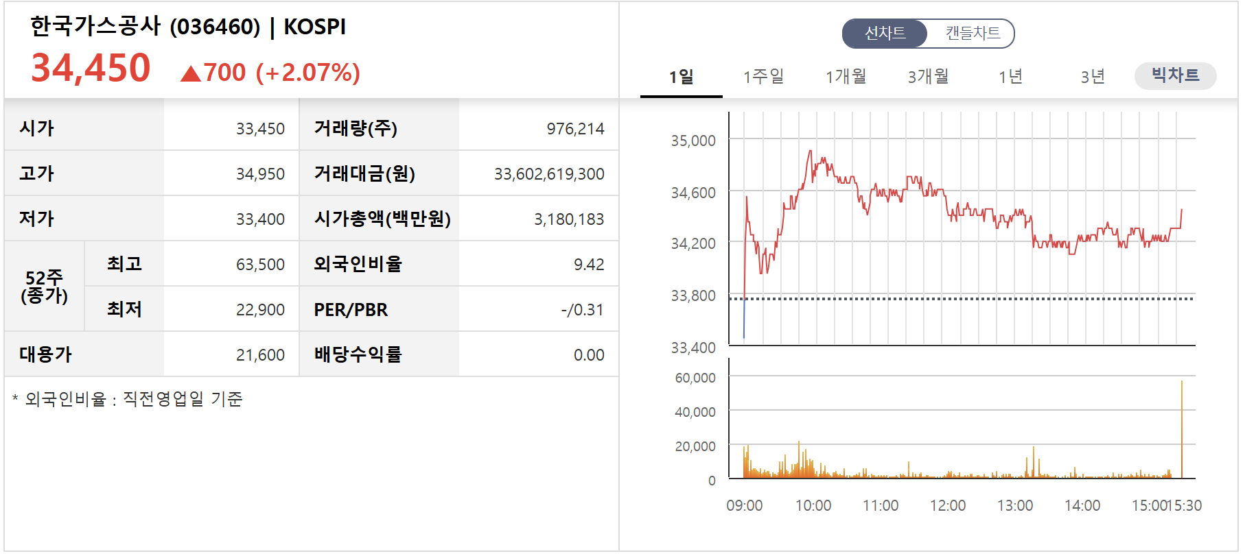 6)한국가스공사: 0.92% 하락하며 33,400원으로 마감되었습니다.