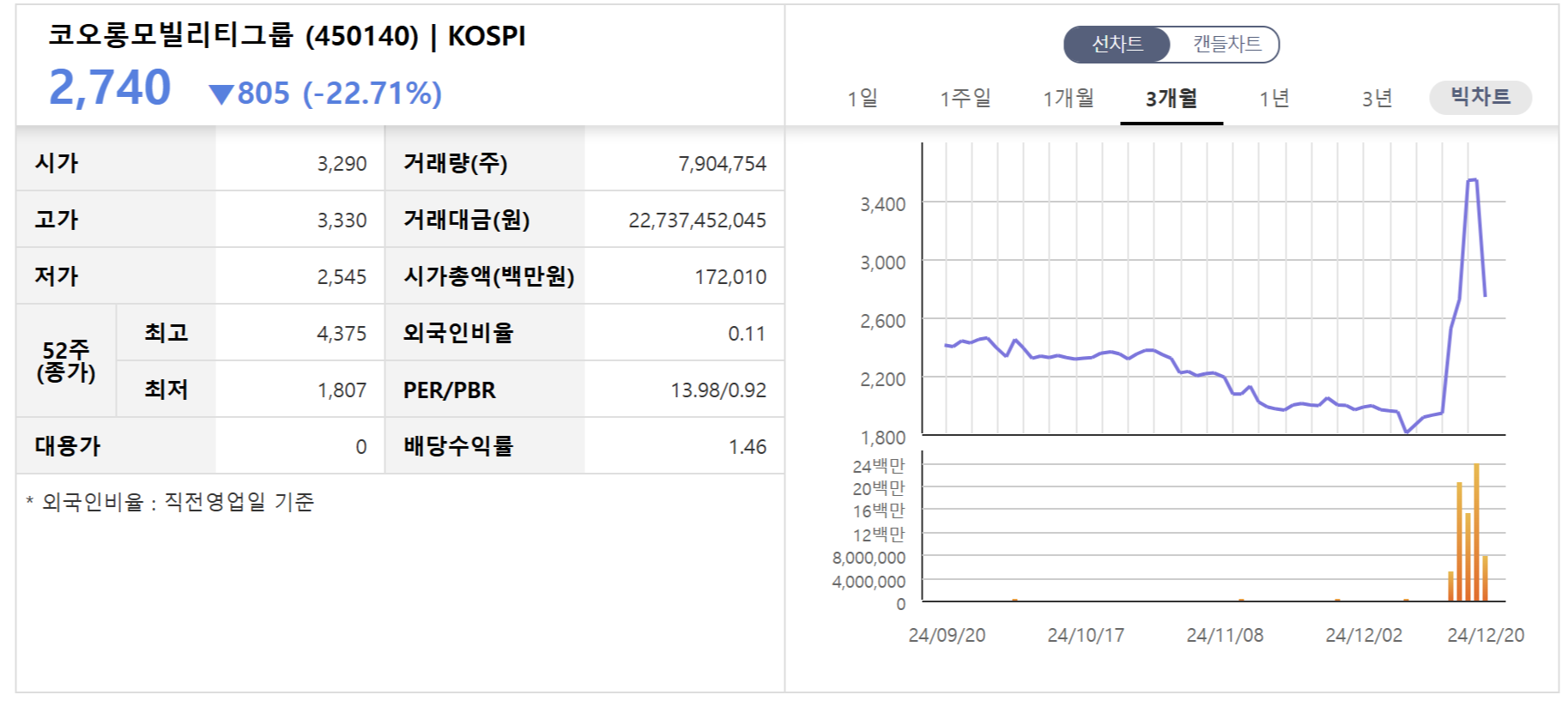 1)코오롱모빌리티그룹 우선주(45014K): 12월 20일 기준 5.42% 하락하며 330,000원으로 조정되었습니다. 최근 3일간의 급등 이후 조정 국면에 들어갔습니다.