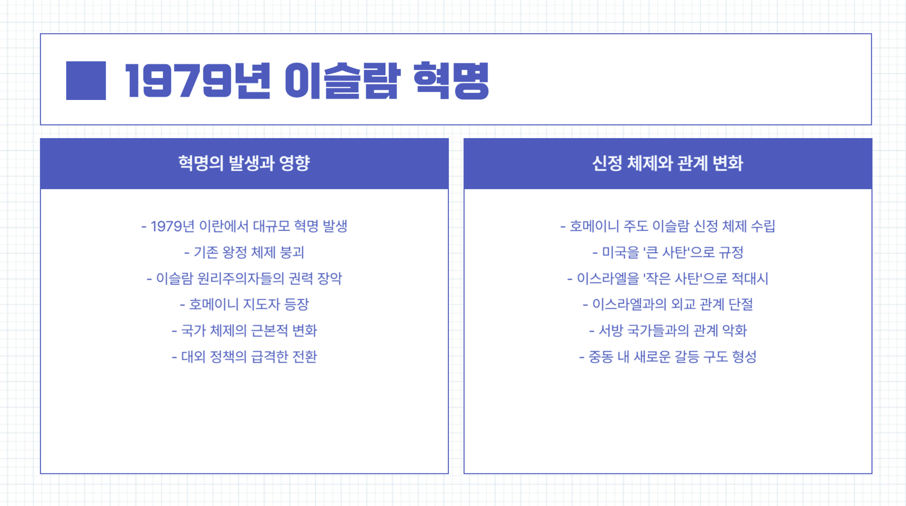 | 갈등 시작 | 1979년 이슬람 혁명 이후 적대관계 전환 |