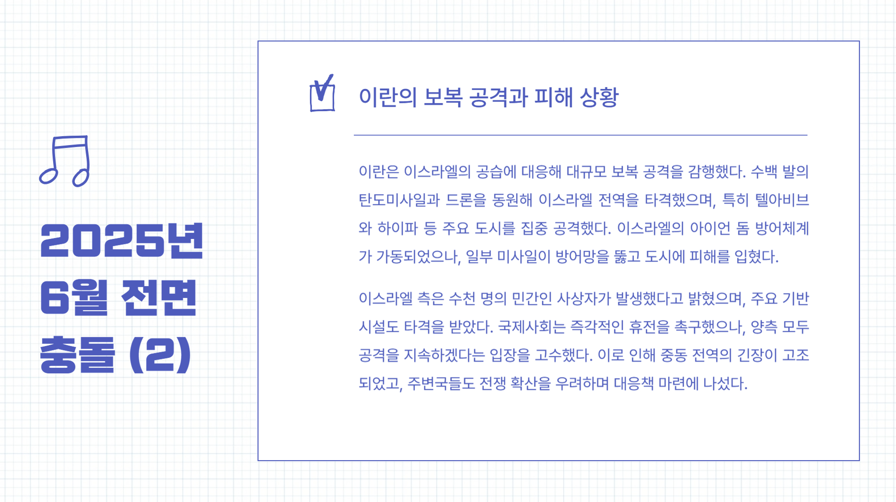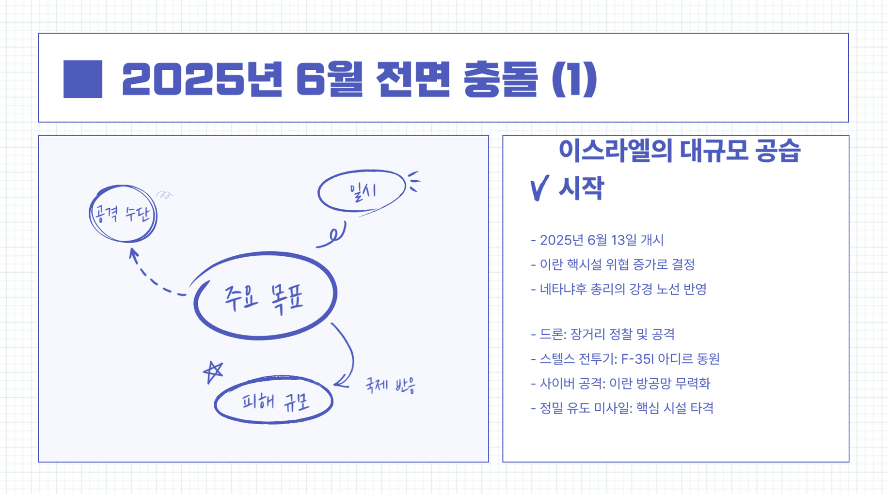 - 2025년 6월 13일, 이스라엘은 이란 핵시설, 미사일 기지 등에 대한 대규모 공습 단행