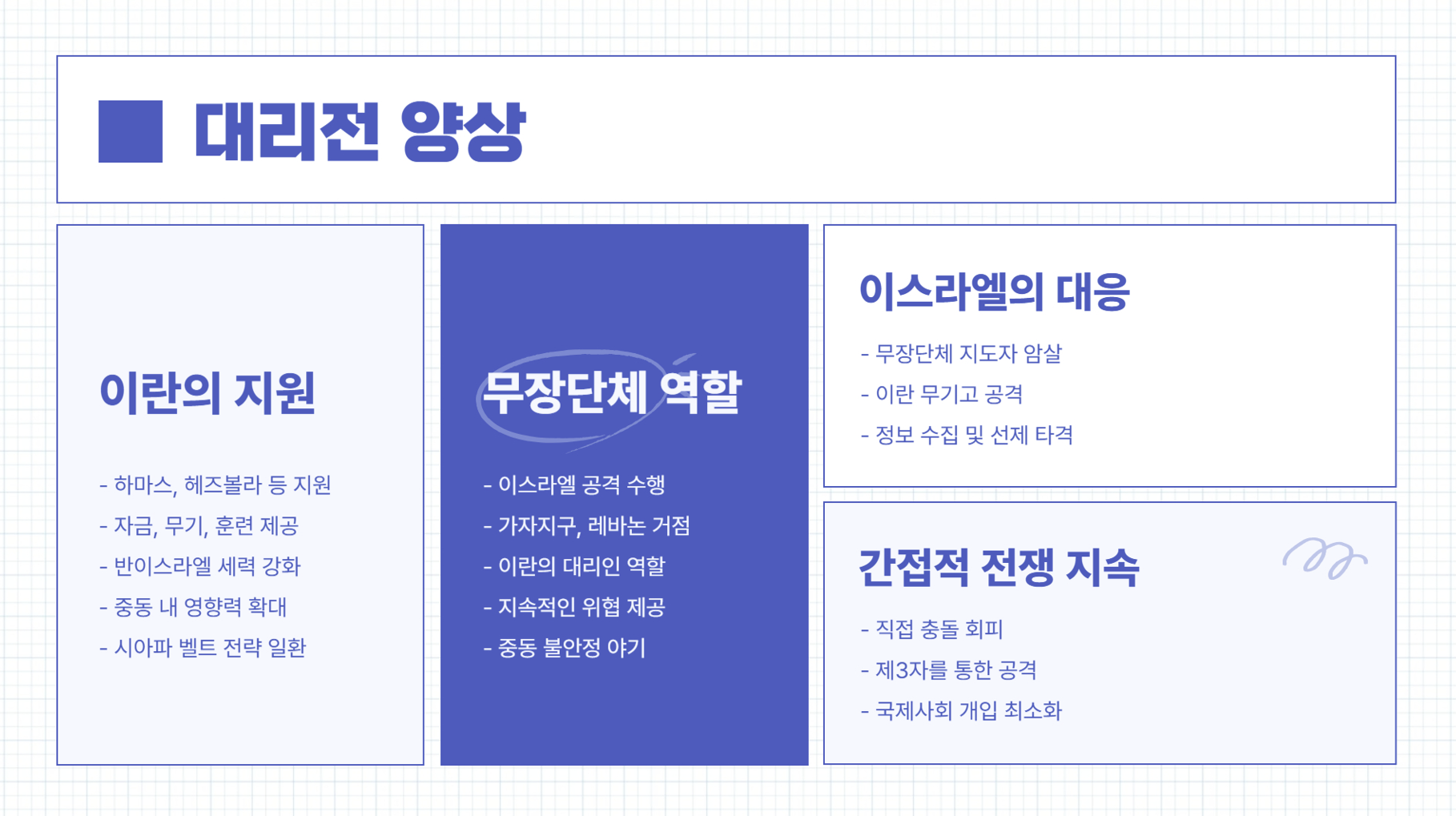| 대리전 | 하마스, 헤즈볼라 등 무장세력 지원과 충돌 |