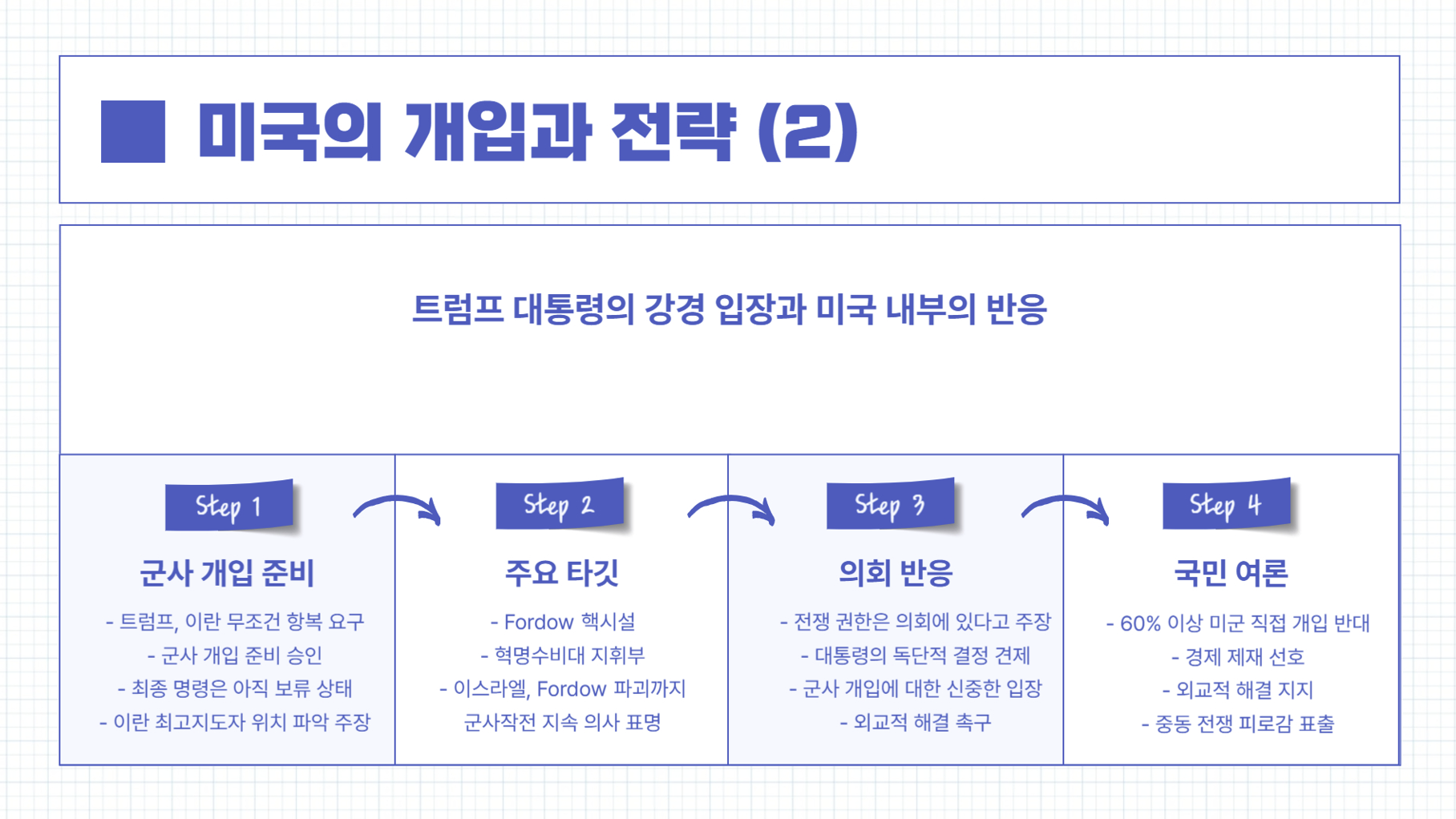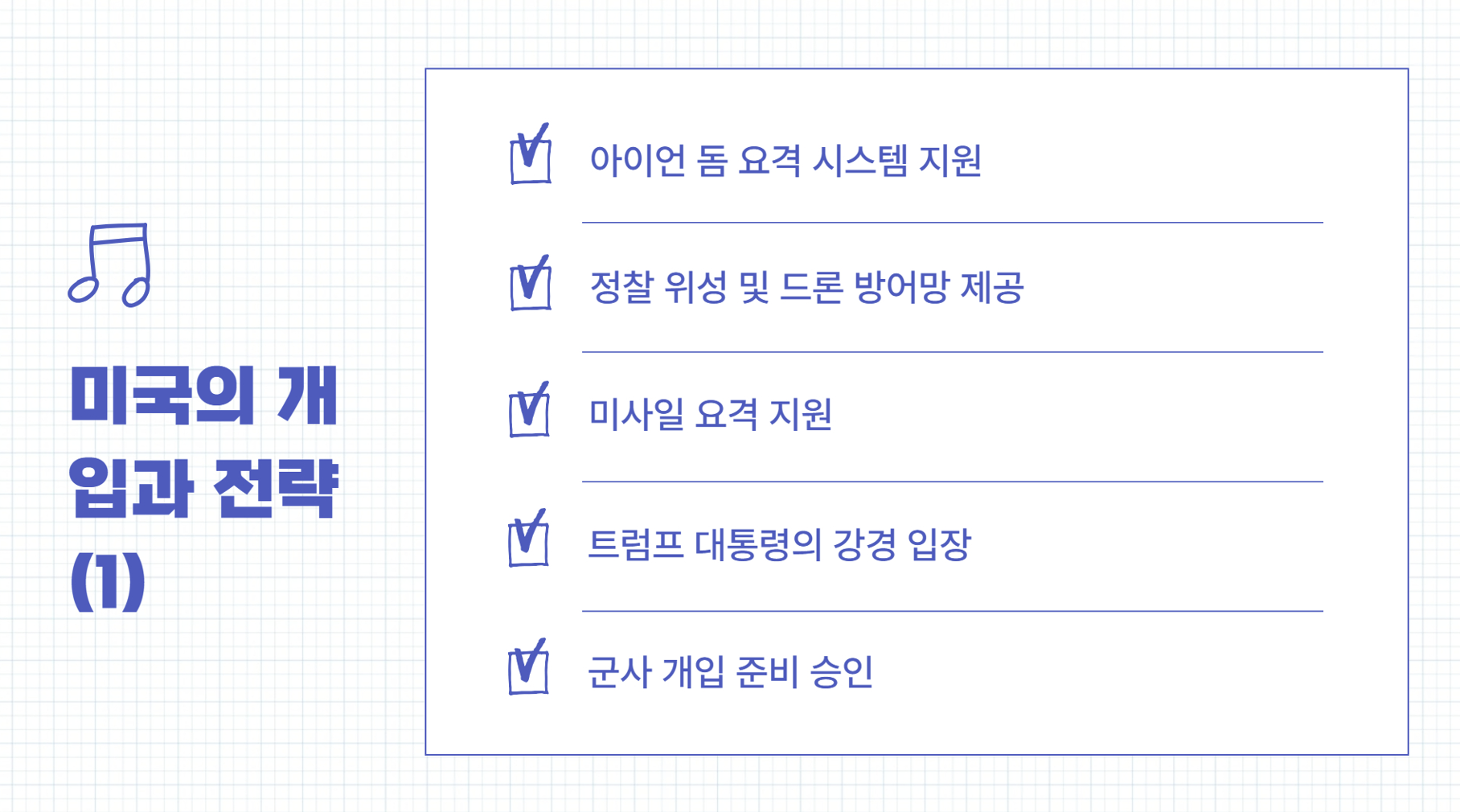 미국의 개입은 이란의 확장을 막는 동시에, 중동 석유 공급선 방어, 이스라엘 동맹 유지 등의 전략적 의미를 가집니다.