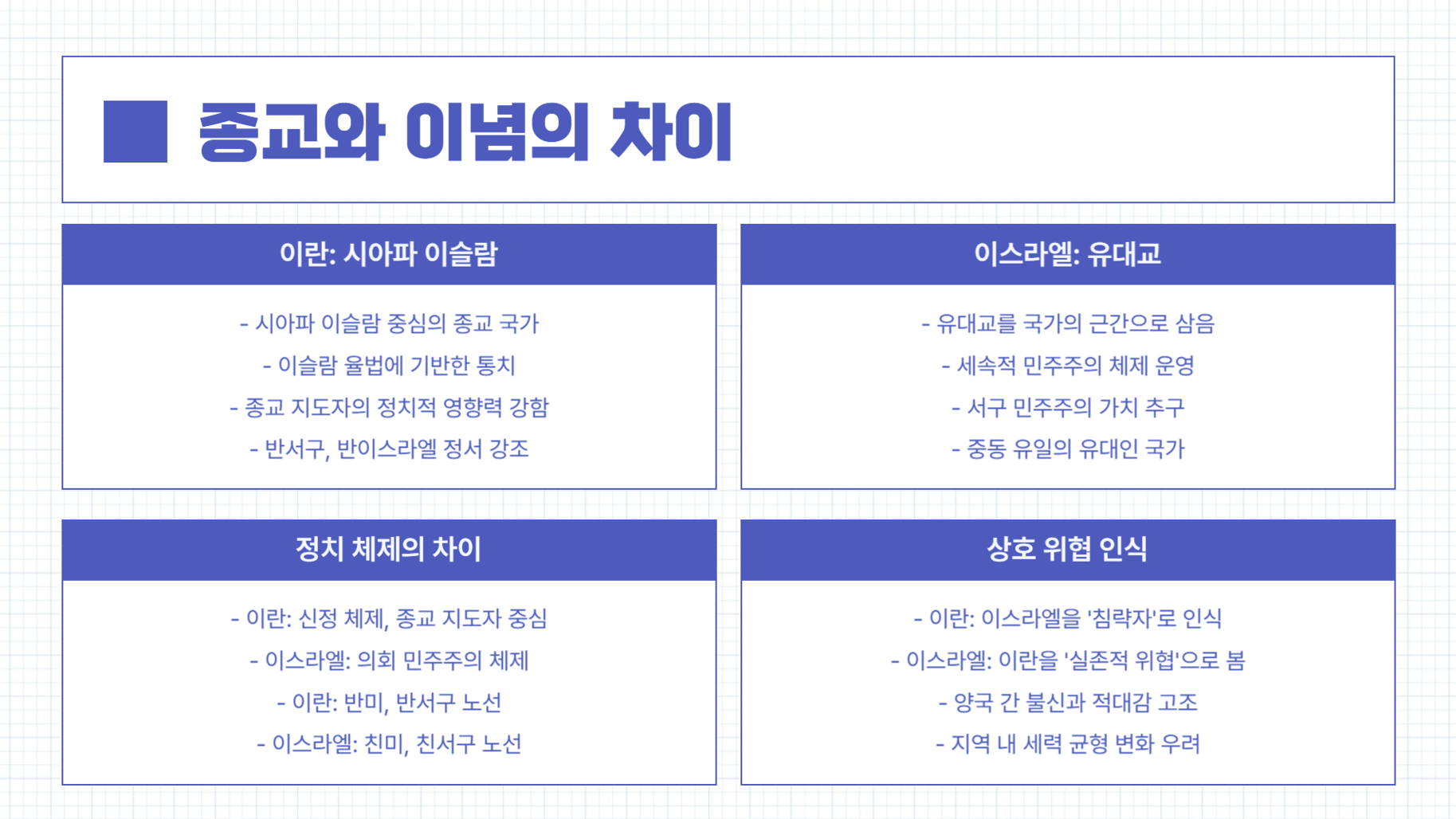 이란은 시아파 벨트(이란-이라크-시리아-레바논)를 통해 중동 내 영향력을 강화하고자 합니다. 반면 이스라엘은 사우디, UAE 등 수니파 국가 및 미국과의 협력을 통해 이를 견제합니다.