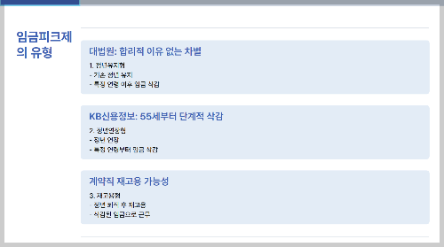 - 예시: 대법원 판결 사례에서는 만 55세 이상 근로자를 대상으로 임금을 삭감한 사례가 있음
