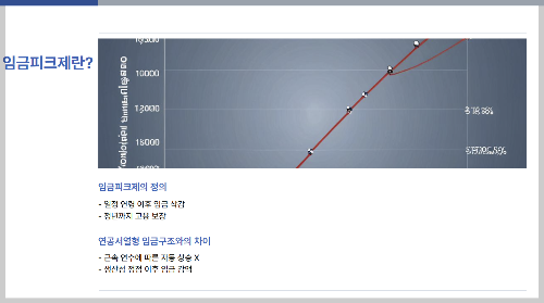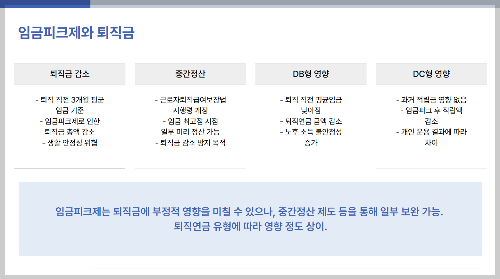 - 임금피크제 도입으로 퇴직 직전 임금이 낮아지면, 결과적으로 퇴직금 총액 감소