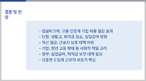 임금피크제는 단순한 임금 조정 제도가 아니라, 노동시장과 기업 경영 전반에 영향을 미치는 중요한 정책입니다. 따라서 도입 시 신중한 검토와 근로자 보호 대책이 필요합니다.