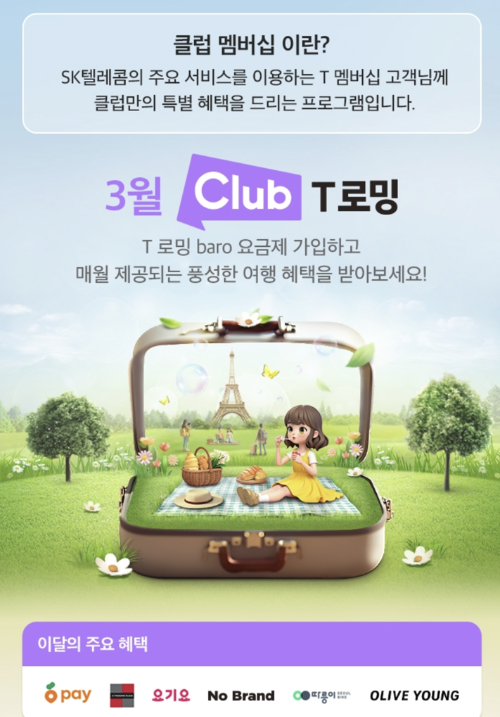 클럽T로밍은 SK텔레콤에서 제공하는 유료 프리미엄 멤버십 로밍 서비스입니다. 일반 로밍보다 약 절반 수준의 저렴한 요금으로 해외에서도 데이터, 음성통화, 문자메시지를 모두 이용할 수 있습니다.