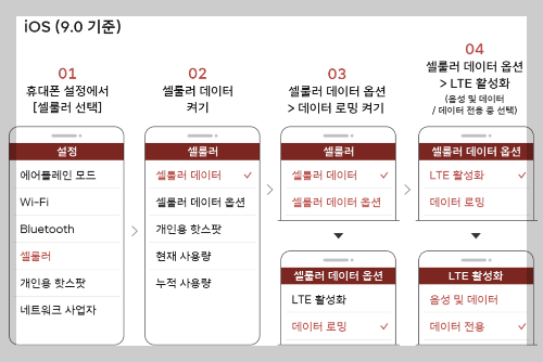 - 아이폰: 설정 → 셀룰러 → 셀룰러 데이터 옵션 → 데이터 모드 → 데이터 절약 모드