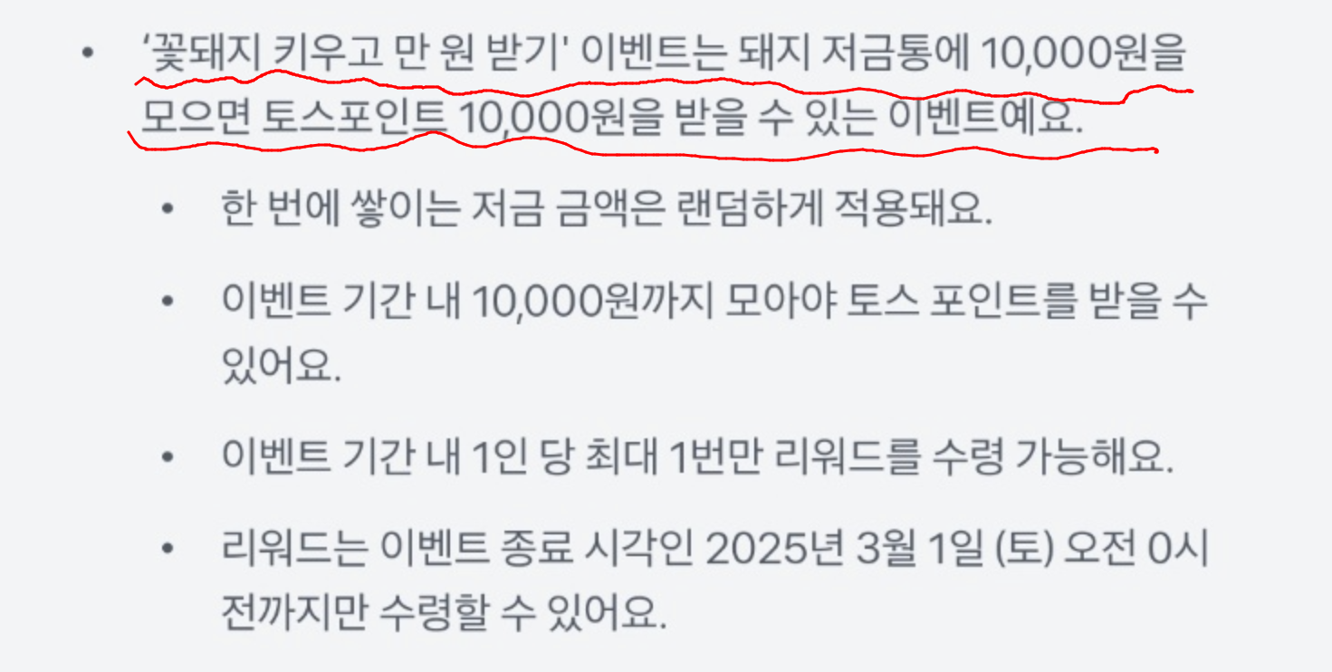 "토스에서 돼지 저금통 이벤트 중! 10,000원 모으면 토스포인트 10,000원 받는 혜택이야. 나도 하고 있는데, 너도 같이 하면 랜덤 저금 기회 받을 수 있어! 참여할래?"