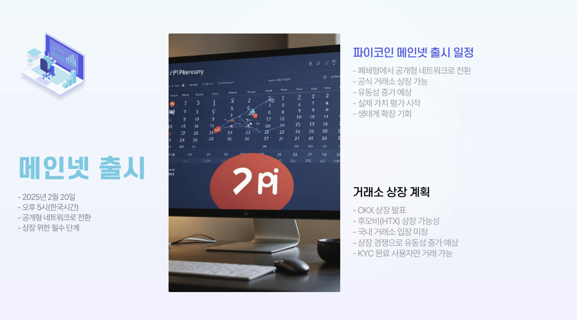 파이코인(Pi Network)은 스마트폰 앱을 통해 누구나 쉽게 채굴할 수 있도록 설계된 암호화폐입니다. 현재까지 공식적인 거래소 상장이 이루어지지 않았으나, 최근 개발팀이 메인넷 출시 일정을 2025년 2월 20일로 확정하면서 투자자들의 관심이 급증하고 있습니다. 특히, OKX 거래소가 파이코인의 상장을 발표하면서 시장의 기대감이 더욱 커지고 있습니다. 그렇다면 파이코인의 상장 가능성과 향후 시세 전망은 어떻게 될까요? 투자자들은 어떤 점을 주의해야 할까요?